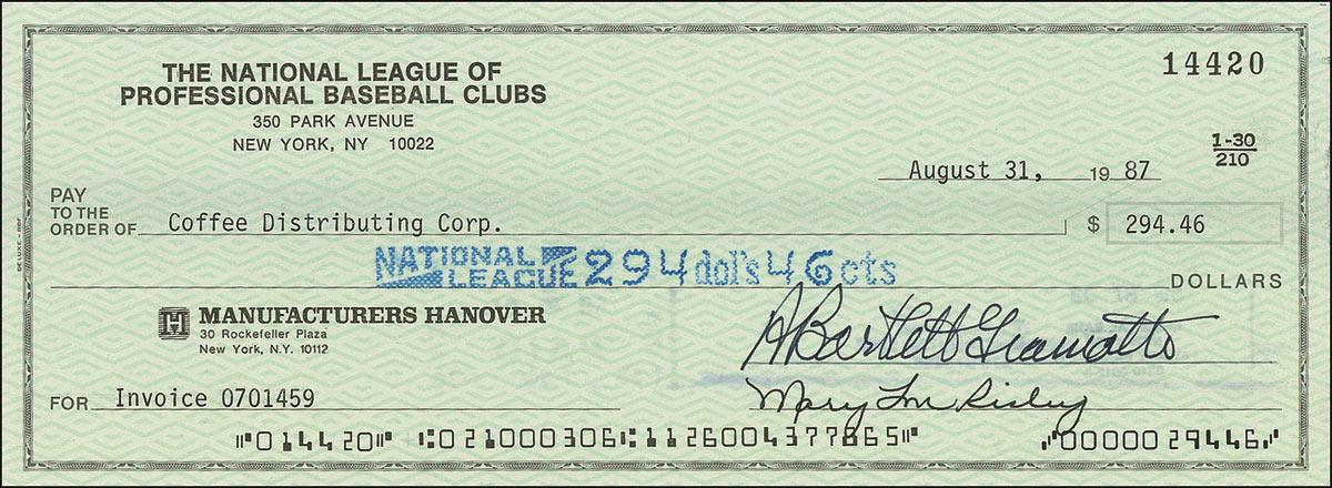 Business check, 8.25 x 3, filled out in type and signed by Giamatti, “A. Bartlett Giamatti,” payable to Coffee Distributing Corp. for $294.46, August 31, 1987. In fine condition, with show-through from cancellation stamp on the reverse. Pre-certified Steve Grad/PSA/DNA and RRAuction COA.