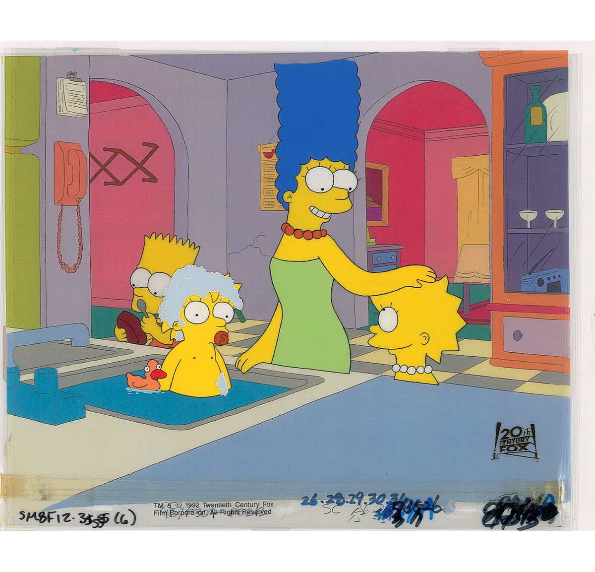 (20th Century Fox, 1992) Original production cel featuring Bart, Maggie, Marge, and Lisa Simpson from The Simpsons episode ‘Lisa the Greek,’ showing the family in the kitchen while Maggie takes a bath in the sink. The cel is placed on a matching studio copy background. Image measures 8 x 7.5, with overall dimensions of 13.5 x 11. 20th Century Fox seal on lower right. In fine condition.