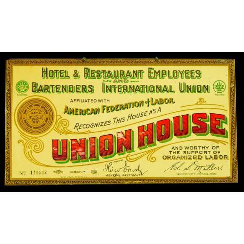 Hotel and Restaurant Employees and Bartenders International Union Tin over cardboard Sign. Chain hanger excellent condition. 11 x 6 inches