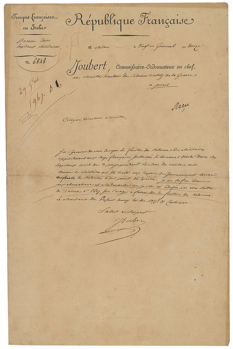 French general (1769-1799) during the Revolution who led troops in Battle of Castiglione and the Battle of Rivoli, attracting the attention of Napoleon Bonaparte. He became the commander of the Army of Italy before being killed during the Battle of Novi in 1799. DS, in French, signed “Joubert,” one page, 9.5 x 14.75, no date. Untranslated official military document. In very good condition, with horizontal and vertical central folds, scattered moderate toning and soiling, creasing to the left edge, and scattered ink marks and notations with several lines of text underlined.
