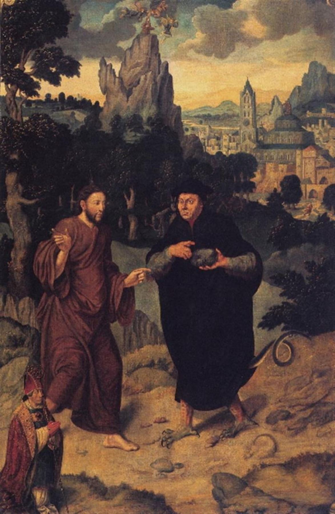 Artist: Bartholomäus Bruyn - Title: Seduction of Christ - Medium: Fine Art Giclee on Canvas - Image Size: Approximately 32 inches x 21 inches - Unframed on Unstretched Canvas - Biography: Bartholomäus Bruyn (1493-1555), usually called Barthel Bruyn or Barthel Bruyn the Elder, was a German Renaissance painter active in Cologne. He painted altarpieces and portraits, and was Cologne's foremost portrait painter of his day. His works are in numerous public collections, including the National Gallery, London; the Metropolitan Museum of Art in New York; and the Louvre in Paris.The Thyssen-Bornemisza Museum in Madrid owns a Nativity and two portraits by Bruyn.