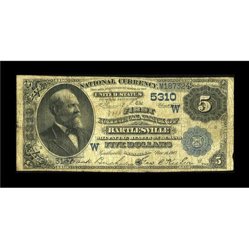<B>Bartlesville, OK</B></I> - $5 1882 Date Back Fr. 538 <B>The First NB</B></I> Ch. # (W)5310<BR>An extremely scarce Bartlesville bank with just eight examples reported to date. This is the sole $5 Date Back listed in the census. Well circulated but completely intact <B>Very Good+,</B></I> with clear signatures of Frank Bucher and Geo. B. Keeler, V. President.<BR><BR><b>Shipping:</b> Coins & Currency (<a target="_blank" href="http://www.heritageauctions.com/common/shipping.php">view shipping information</a>)