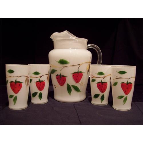 Beautiful and very hard to find hand painted glass pitcher and 4 tumblers by Bartlett-Collins from the 1950's. The glass is fired on white in the inside, and hand painted on the outside. This is usually associated with Fire King Gay Fad, and it really looks the same. The colors are Vibrant with Deep red strawberries and green leaves with gold gilded accents. The 64 ounce Pitcher has the ice lip and a clear glass attached handle. The tumblers are the 10 ounce size. The set is in excellent condition, there is minimal if any wear to the gold accents. No chips or cracks.