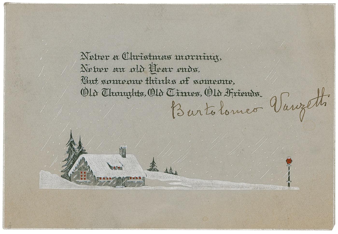 Italian-born fish peddler, he and Nicola Sacco were charged with armed robbery and murder in Massachusetts. On April 15, 1920, the paymaster and a guard at a South Braintree shoe factory were murdered for $15,776. Sacco and Vanzetti, both anarchists, were arrested. Although the prosecution could not trace the money to the defendants, they were convicted and later executed. Engraved Christmas Card poem, 4.75 x 3.25, signed in fountain pen “Bartolomeo Vanzetti.” The greeting reads in full: “Never a Christmas morning, Never an old Year ends, But someone thinks of someone, Old Thoughts, Old Times, Old Friends.”
