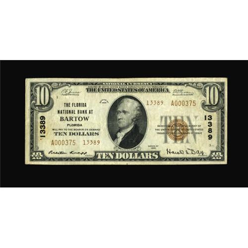 <B>Bartow, FL</B></I> - $10 1929 Ty. 2 <B>The Florida NB</B></I> Ch. # 13389<BR> A nice <B>Very Fine </B></I>from a scarce and desirable bank. While two issuers were located here, this was the only one that issued the 1929 series. We did sell a $10 Type 2 from here in Fine at our 2007 Florida United Numismatists auction for $1437.50 on an estimate of $600 - $900. The market is still strong for Florida Nationals, and we expect to see that realization equaled and possibly surpassed tonight.<BR><BR><b>Shipping:</b> Coins & Currency (<a target="_blank" href="http://www.heritageauctions.com/common/shipping.php">view shipping information</a>)