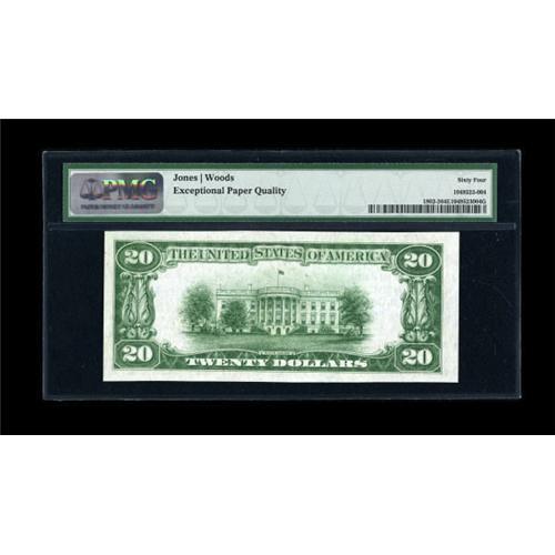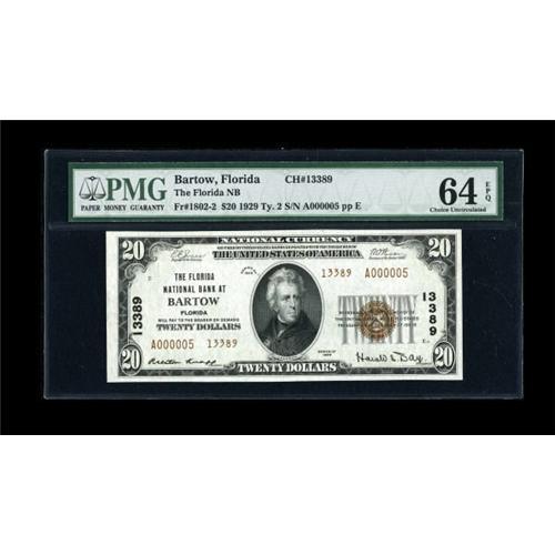 <B>Bartow, FL</B></I> - $20 1929 Ty. 2 <B>The Florida NB</B></I> Ch. # 13389<BR> A lovely example which was formerly part of the Dick Erett collection of serial number 5 notes. Its pedigree goes back to the very first CAA sale in 1990, where it was lot 479. While the centering of this lovely piece is not perfect, resulting in the PMG grade of <B>Choice Uncirculated 64 EPQ,</B></I> its originality and embossing is certainly evident, with PMG bestowing the coveted EPQ designation to this most attractive single digit serial specimen. <BR><I>From The Sunshine State Collection.</B></I><BR><BR><b>Shipping:</b> Coins & Currency (<a target="_blank" href="http://www.heritageauctions.com/common/shipping.php">view shipping information</a>)
