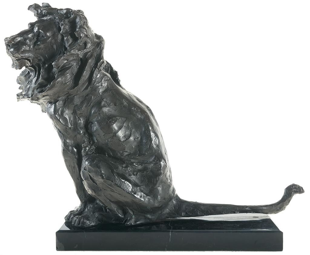 This unique "BARYE" marked sitting bronze lion with a wind blown mane is mounted on a black marble plinth and measures 19 1/2 inches tall x 8 inches deep x 25 inches wide including the plinth. Cast after Antoine Louis Barye's death. Excellent. The lion shows a few light handling marks, the plinth is fine with a couple of edge marks and a couple of chips on the top behind the lion's tail.