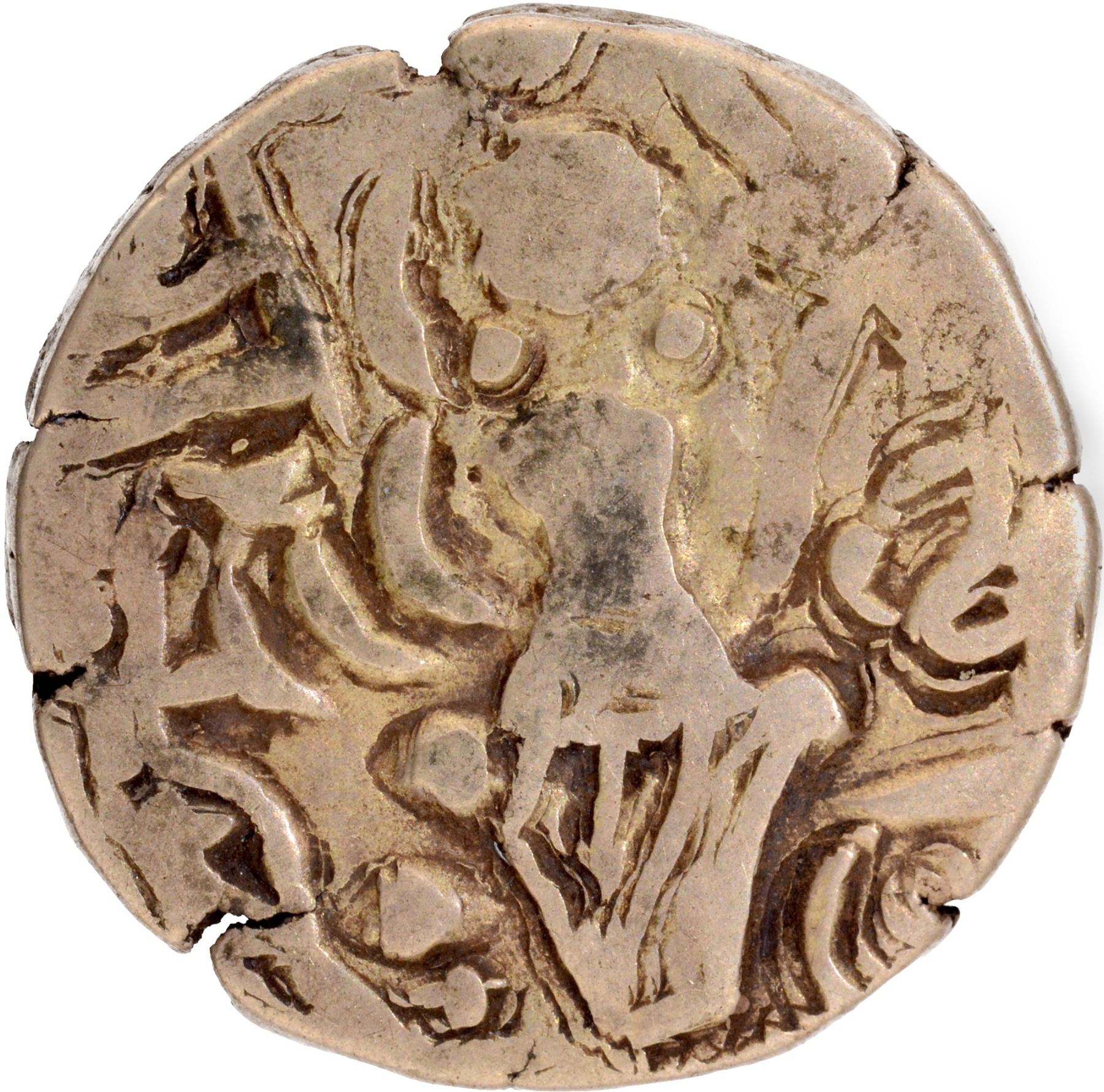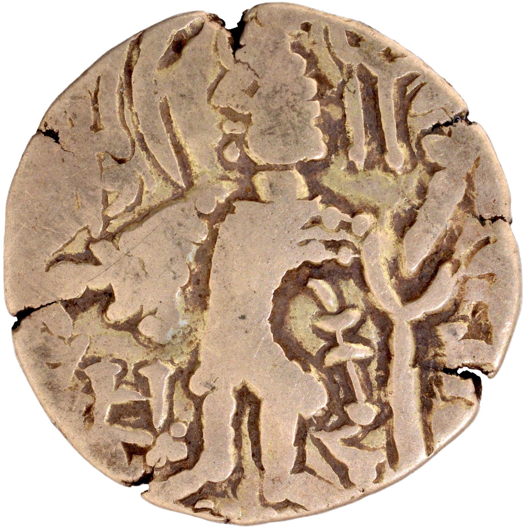 Later Kushan Dynasty, Kidara-Kushan (365-390 CE), Base Gold Dinar, "Ardokhsho" type, Obv: the king, crowned and nimbate, standing facing left, sacrificing over an altar, a ribboned trident surmounts the altar, holding a standard in his left hand, the Brahmi legends "Kapana" next to the altar, "Kidara" under his raised left arm and "Kushana" to the outer right, Rev: the goddess Ardokhsho enthroned, nimbate, facing forward, holding a cornucopia in her left hand and a diadem with a ladder-like ribbon in her extended right hand, the Brahmi initial “Ala” on the right field, a tamgha on the upper-left field, a dotted border around the field, 7.76g, 21.14mm, (Gobl # 617/Jongward & Cribb # 2443), about very fine, Rare.