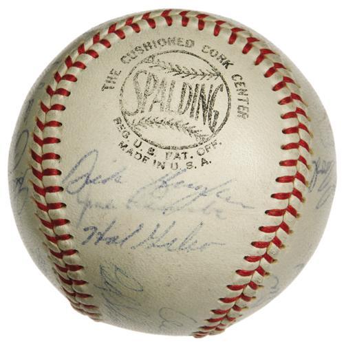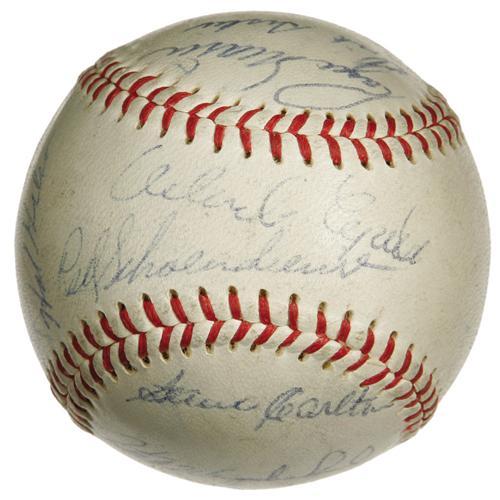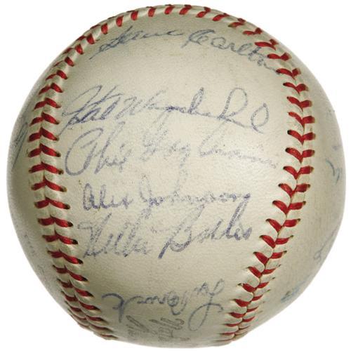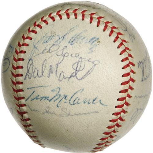 <B>1967 St. Louis Cardinals Team Signed Baseball.</B></I> The enablers of the Bambino's Curse, the '67 Cards teased the Boston Red Sox with a World Series Game Seven before Bob Gibson closed out the Series with a nine-inning gem. The Hall of Fame pitcher is joined on this ONL (Giles) ball by nineteen fellow World Champs, featuring top talent like Maris, Brock, Carlton, Flood, Cepeda and Schoendienst. Signature quality never veers more than a point in either direction from 8/10, and the ball is clean and white. <I>LOA from PSA/DNA. LOA from James Spence Authentication.</B></I><BR><BR><b>Shipping:</b> Balls, etc. (<a target="_blank" href="http://www.heritageauctions.com/common/shipping.php">view shipping information</a>)