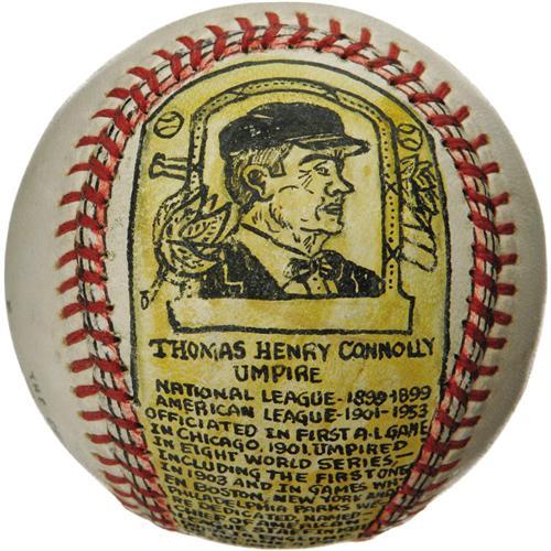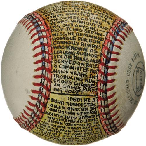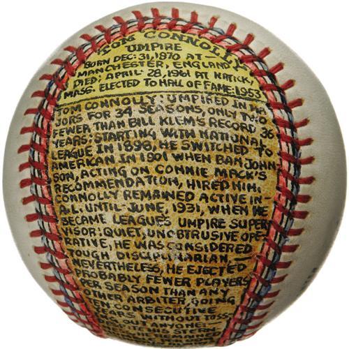 <B>George Sosnak Folk Art Baseball, Tom Connolly.</B></I> Perhaps only Leroy Neiman's name is more recognizable to collectors when it comes to the field of sports art. And while the styles of these two celebrated artists couldn't be more different, their love and appreciation for the subjects of their work is evident. George Sosnak began his career in baseball as an umpire of military games in Germany after the Second World War, later attending umpiring school in Florida, where he called balls and strikes at Detroit Tigers Spring Training games. It was around this time that Sosnak began to develop his distinctive folk art style, characterized by charmingly crude figures and painstakingly rendered text and statistics applied with almost mathematical precision. It has been estimated that the examples of Sosnak's art baseballs number in the low hundreds, and so it is quite an event that we are able to present eight here for the enjoyment of our bidding clientele. We invite you to pick your favorite-it will be a tough decision to make.<BR><BR>Sosnak offers his charming reproduction of the Hall of Fame umpire's Cooperstown plaque, pairing it with a rather involved biography. Half of the baseball remains untouched by Sosnak's hand, not uncommon within his body of work.<BR><BR><b>Shipping:</b> Balls, Pucks, etc., Small (<a target="_blank" href="http://www.heritageauctions.com/common/shipping.php">view shipping information</a>)