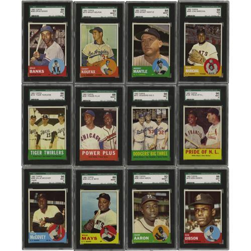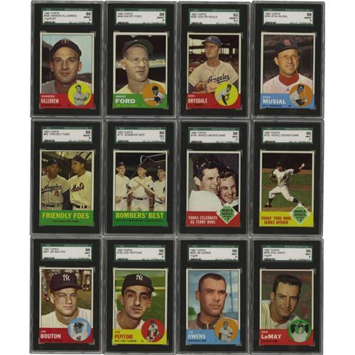 <B>1963 Topps Baseball High Grade Complete Set (576).</B></I> The 1963 Topps set is among the most popular of its era, due in large part to the attractive card design and the inclusion of the high-numbered Pete Rose rookie. Based on the quality and the condition of this set overall, it appears to be a vending set that was put together and stored away since its original year of issue. An incredible total of eighty-eight cards have been graded by SGC with an aggregate SMR value of $17,142. <B>SGC 98 GEM 10:</B></I> # 440 Marichal. <B>SGC 96 MINT 9:</B></I> 38 cards w/ # 119, 127, 130, 138 Pride of the NL, 139, 142, 148, 151, 153, 157, 183, 203, 206, 207, 218, 235, 243, 249, 254, 267, 268, 373, 380 Banks, 385, 396, 401, 405, 409, 412 Dodgers' Big Three, 415 Gibson, 422, 436, 438, 439, 459, 483, 490 McCovey, 503. <B>SGC 92 NM-MT+ 8.5:</B></I> 21 cards w/ # 9 NL SO Leaders, 48, 63, 133, 136, 161, 186, 192, 210 Koufax, 252, 270, 360 Drysdale, 381, 390 Aaron, 391, 428, 435, 443, 450, 485, 499. <B>SGC 88 NM-MT 8:</B></I> 18 cards w/ # 68 Friendly Foes, 126, 140, 200 Mantle, 221, 242 Power Plus, 250 Musial, 279, 300 Mays, 374, 375, 377, 398, 419, 446 Ford, 451, 470, 500 Killebrew. <B>SGC 86 NM+ 7.5:</B></I> 5 cards w/ # 3 NL HR Leaders, 4 AL HR Leaders, 25 Kaline, 173 Bombers' Best, 400 F. Robinson. <B>SGC 84 NM 7:</B></I> 4 cards w/ # 6 AL ERA Leaders, 120 Maris, 271, 448. <B>SGC 60 EX 5:</B></I> # 537 Rose. <B>Ungraded cards include:</B></I> #2 Mantle LL (EX), 18 Buc Blasters (NM), 115 Yastrzemski (VG), 169 Perry (EX), 228 Oliva (EX/MT), 247 Yankees (NM), 275 Mathews (EX/MT), 320 Spahn (EX), 340 Berra (EX), 345 Robinson (EX/MT), 466 Freehan (EX), 472 Brock (EX/MT), 540 Clemente (VG) 544 Staub (VG), 550 Snider (VG), 553 Stargell (GD/VG). Grades 65% NM to NM/MT, 30 % EX to EX/MT, 5% VG/EX or lesser.<BR><BR><b>Shipping:</b> Sportscard (<a target="_blank" href="http://www.heritageauctions.com/common/shipping.php">view shipping information</a>)