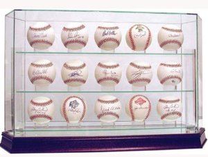 Glass 15-Ball Case. "Each UV-protected display case is hand-made and includes a removable glass top for easy access. With a mirrored bottom and stunning cherry wood base, your memorabilia will look stylish and protected in any setting. This 15 baseball display case measures in overall size of: 22.50 inches in length, with a width/depth of 6.50 inches and a height of 13.5 inches." Baseballs sold separately.