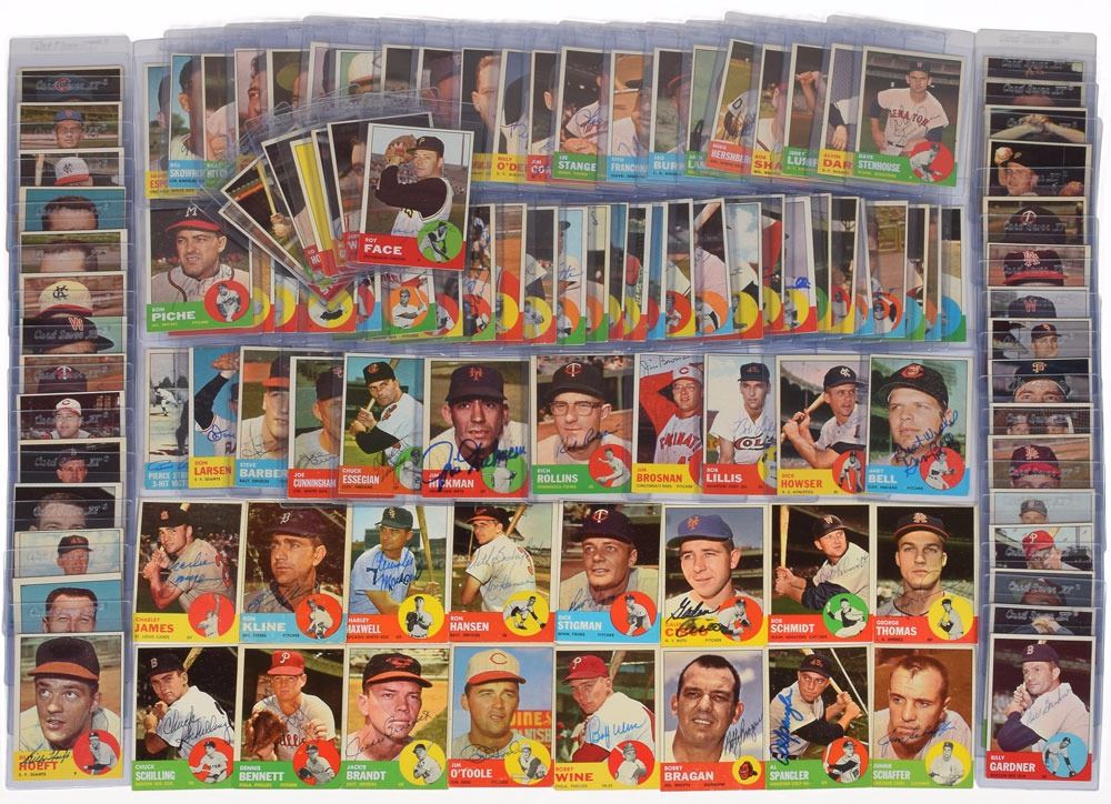 Signed partial set of 1963 Topps baseball cards, consisting of 111 signed cards, with highlights including Don Larsen, Billy Pierce, Bobby Bragan, Jim O'Toole, Dick Groat, Frank Torre, Mickey Vernon, Tito Francona, and others. In overall very good to fine condition, with brushing to a few of the signatures. Most cards are held in card saver sleeves.