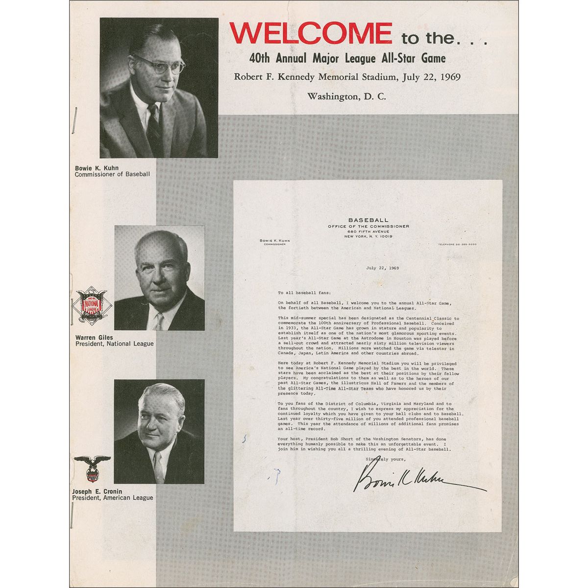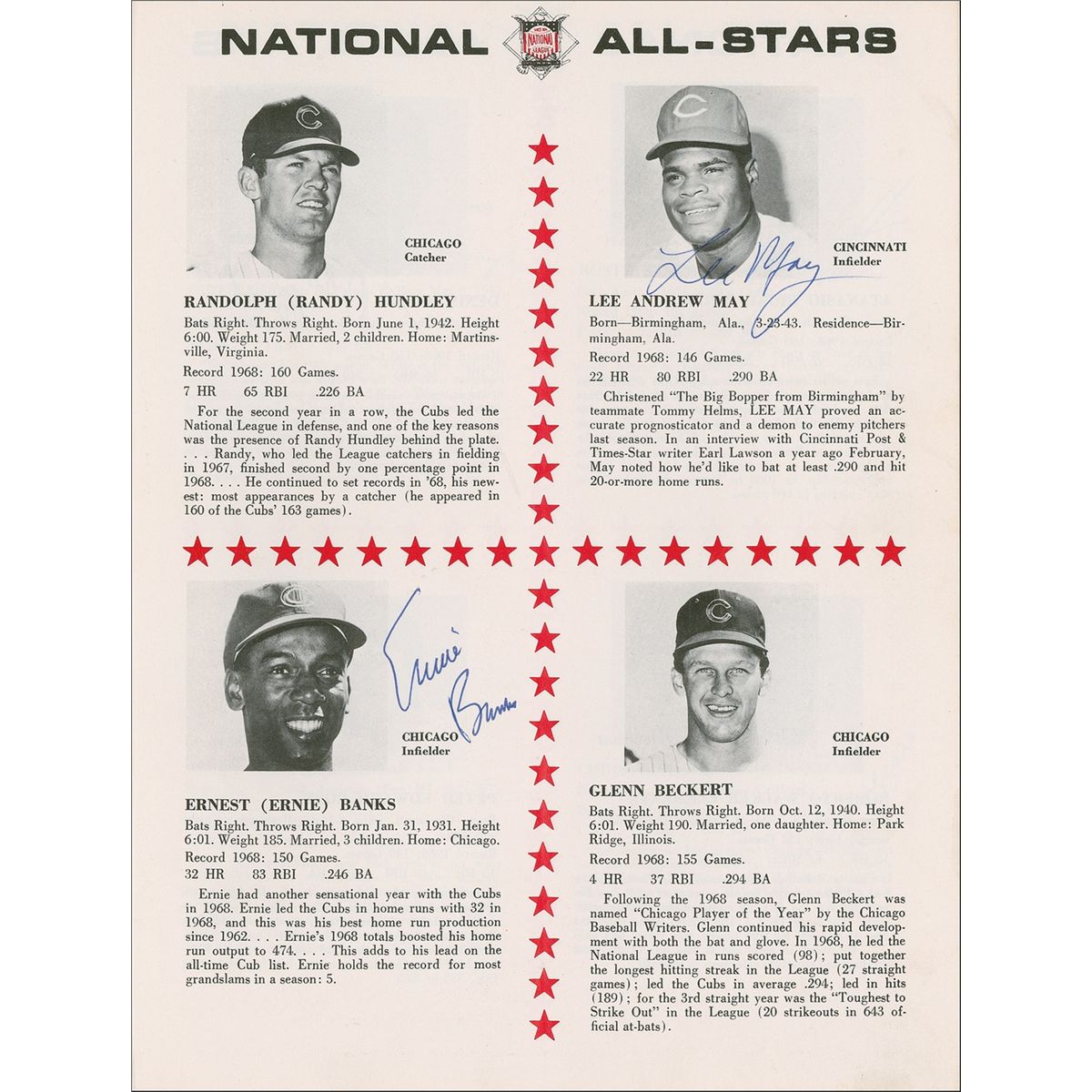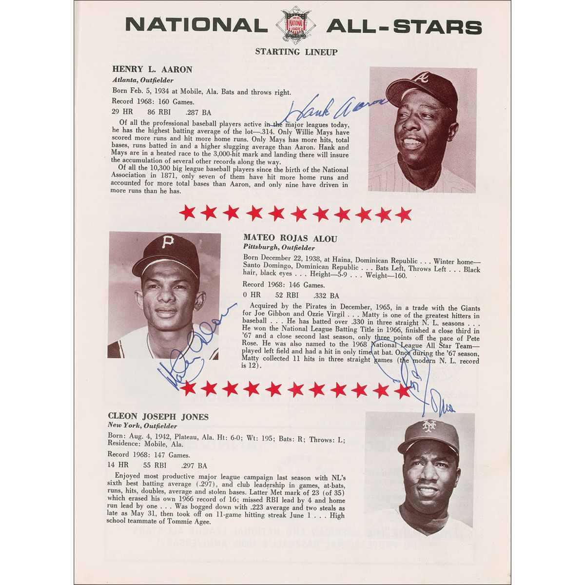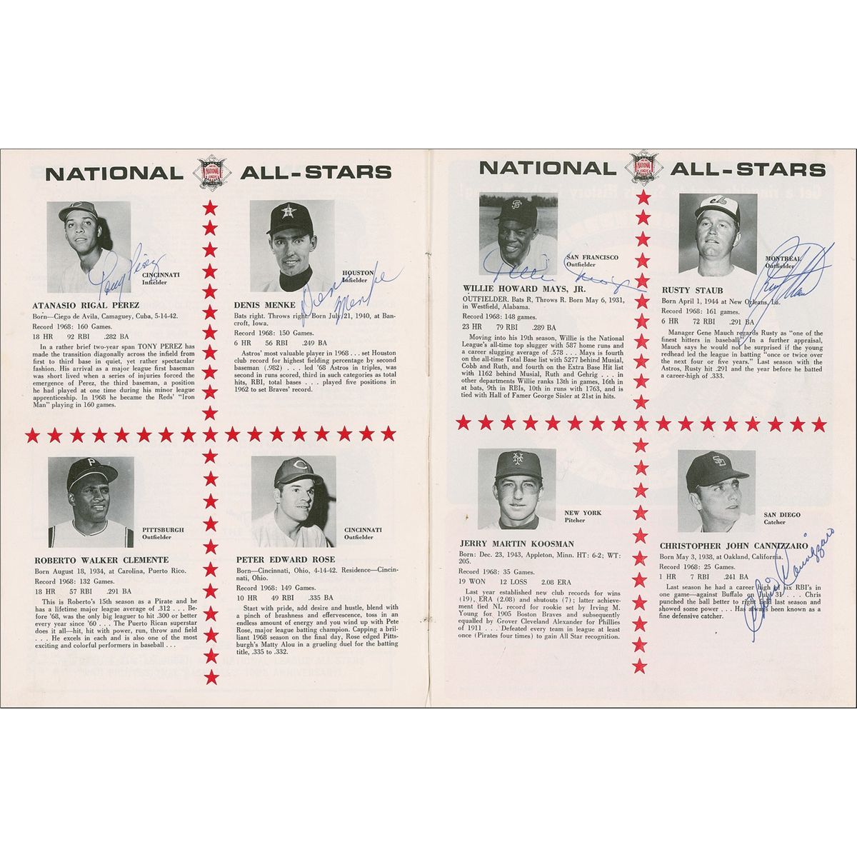 Program from the 1969 All Star Game, 8.5 x 11, signed inside in ballpoint by 22 all stars, mostly National League, all signing by their respective image. Signers are: Hank Aaron, Johnny Bench, Willie McCovey, Willie Mays, Felix Millan, Ron Santo, Don Kessinger, Matty Alou, Cleon Jones, Lee May, Ernie Banks, Tony Perez, Denis Menke, Rusty Staub, Bob Gibson, Juan Marichal, Bill Singer, Steve Carlton, Phil Niekro, Grant Jackson, Larry Dierker, and Chris Cannizzaro. In very good condition, with missing front cover, central vertical crease, and scattered soiling and handling wear.