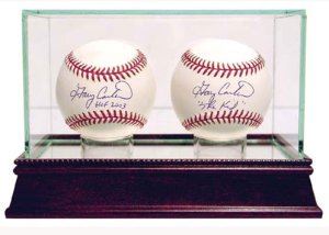 Glass 2-Ball Baseball Case. "Each UV-protected display case is hand-made and includes a removable glass top for easy access. With a mirrored bottom and stunning cherry wood base, your memorabilia will look stylish and protected in any setting.This double baseball display case measures in overall size of: 8 inches in length, with a width of 4.75 inches and a height of 5.25 inches. The available space within the case is 7 inches in length, with a width and a height of 3.75 inches." Baseballs sold separately.