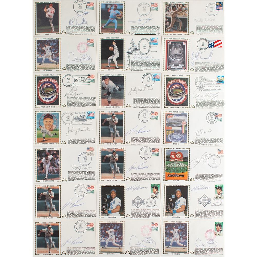 Collection of 21 Gateway covers with silk color cachets honoring various baseball players and events, each signed in ink by one of more players. Includes: Roger Clemens, Don Drysdale and Orel Hershiser, Pete Rose, Bo Jackson (2), Cecil Fielder (3), Jose Canseco (4), Alan Trammell and Robin Ventura, Mark Grace and Mike Bielecki, Jose Rijo, Eric Davis, Rob Dibble and Norm Charlton, Johnny Vander Meer (2), Benito Santiago, and Rick Sutcliffe. In overall fine condition.