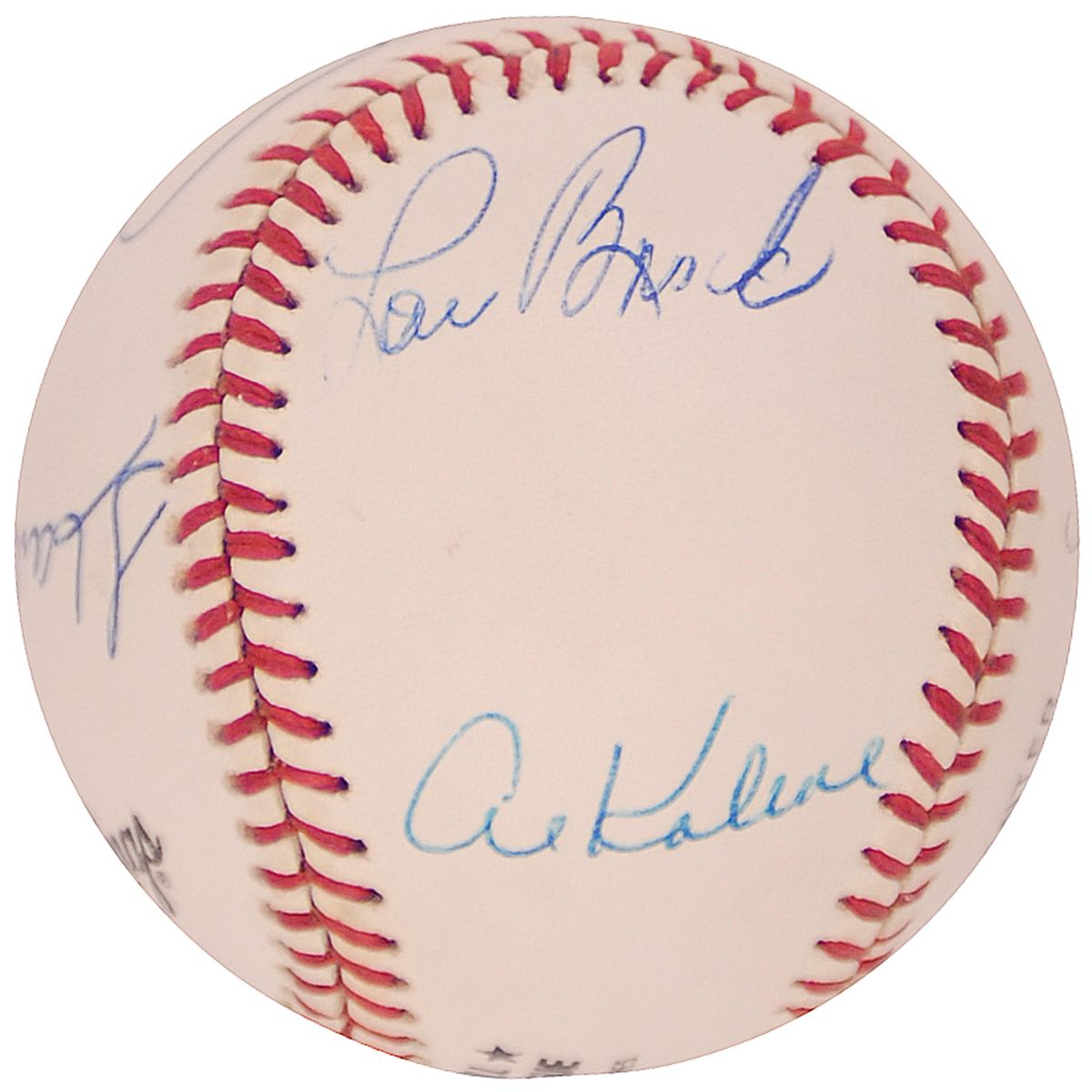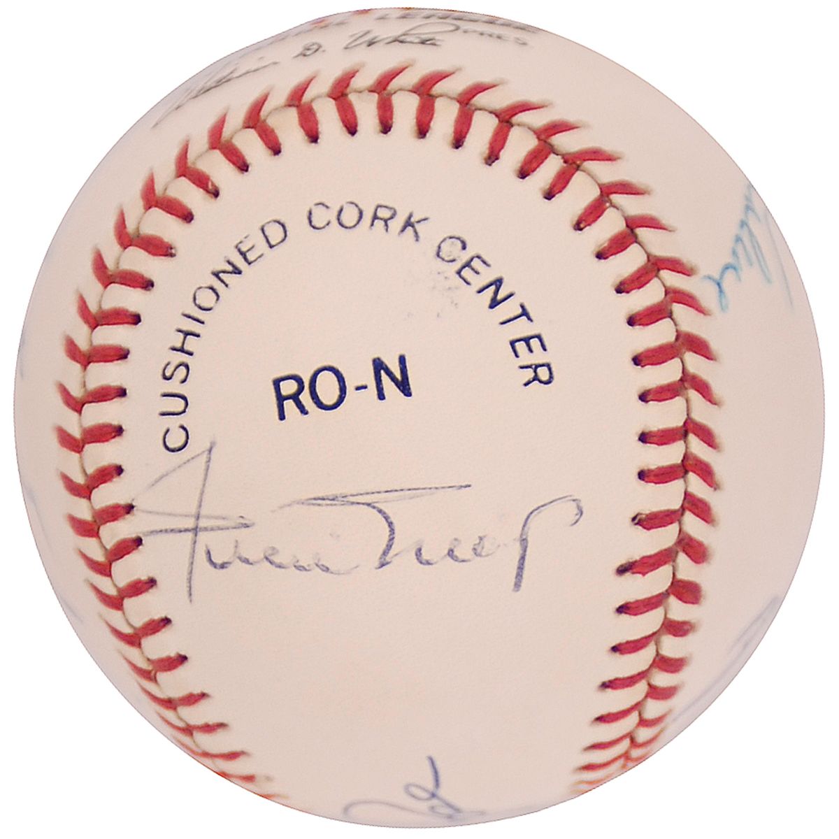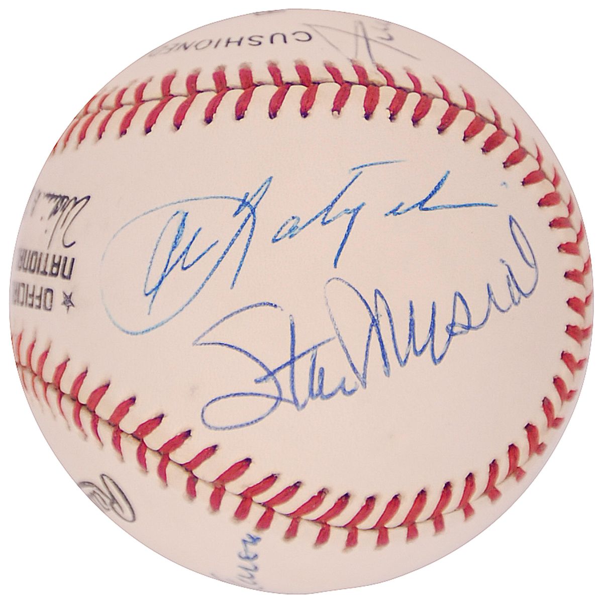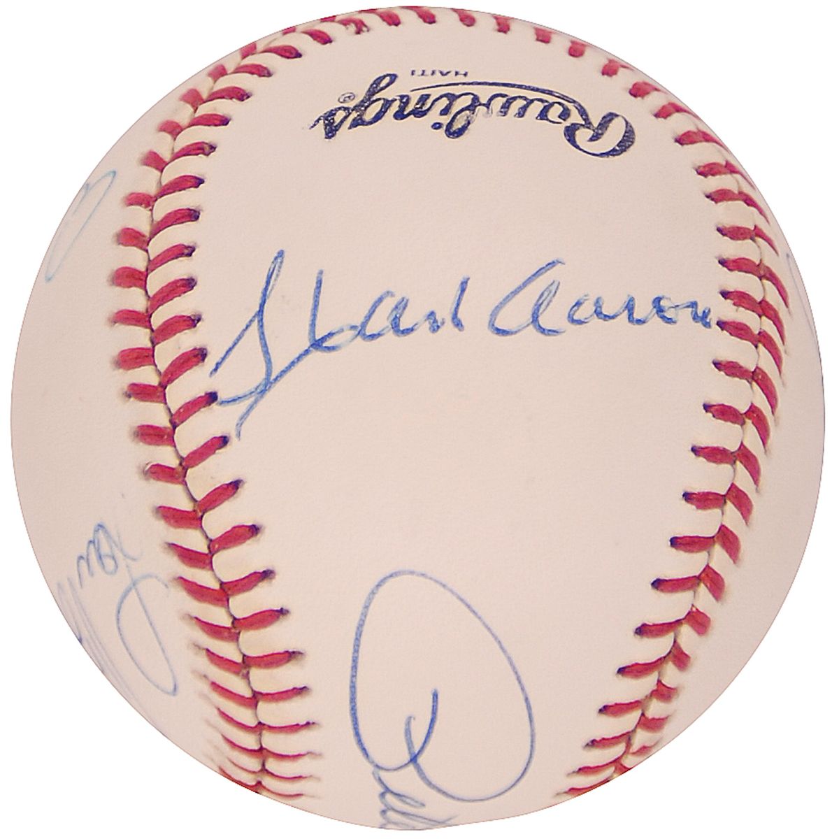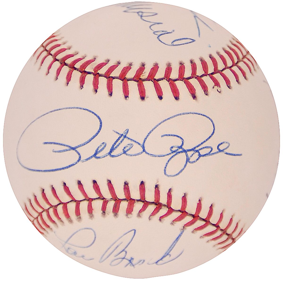 Official Rawlings National League baseball signed in blue and black ballpoint by seven members of the 3000 Hit Club: Pete Rose (ss), Hank Aaron, Willie Mays, Stan Musial, Lou Brock, Al Kaline, and Carl Yastrzemski. In fine condition, the signatures remain crisp and bold.
