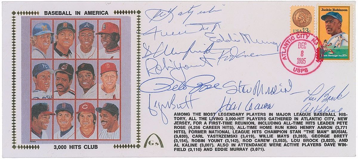 Gateway cover with a silk cachet honoring the elite 3000 Hit Club, 9.5 x 4, signed in blue ballpoint by Carl Yastrzemski, Willie Mays, Eddie Murray, Dave Winfield, Robin Yount, Rod Carew, Stan Musial, George Brett, Hank Aaron, Lou Brock, Al Kaline, and Pete Rose. In fine condition. Accompanied by a full letter of authenticity from JSA.