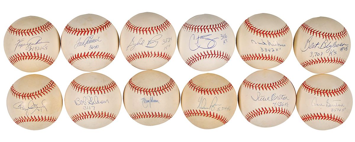 Twelve official Rawlings baseballs, each signed in ballpoint on the sweet spot by a different member of the 3000 strikeout club, with most also adding their career totals. Signers are: Nolan Ryan, Randy Johnson, Roger Clemens, Steve Carlton, Bert Blyleven, Tom Seaver, Don Sutton, Gaylord Perry, Phil Niekro, Fergie Jenkins, Bob Gibson, and Curt Schilling. In very good overall condition, with scattered toning and some light brushing to a couple of signatures.
