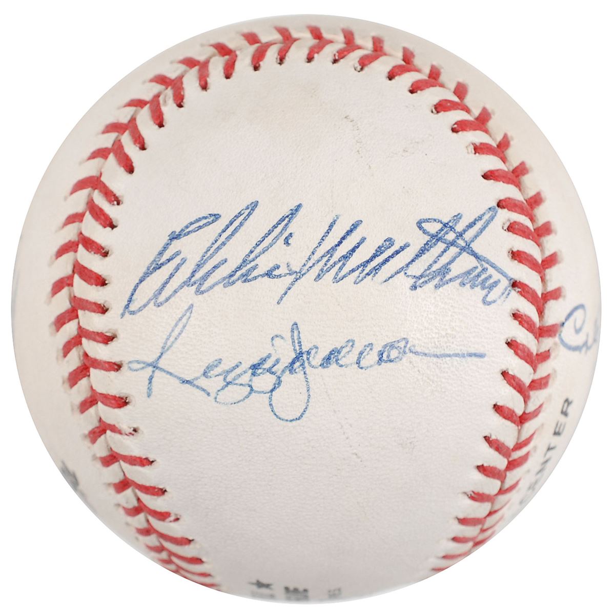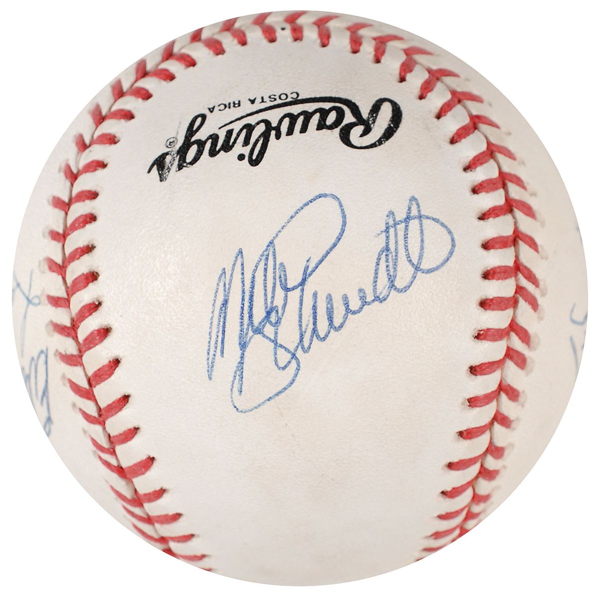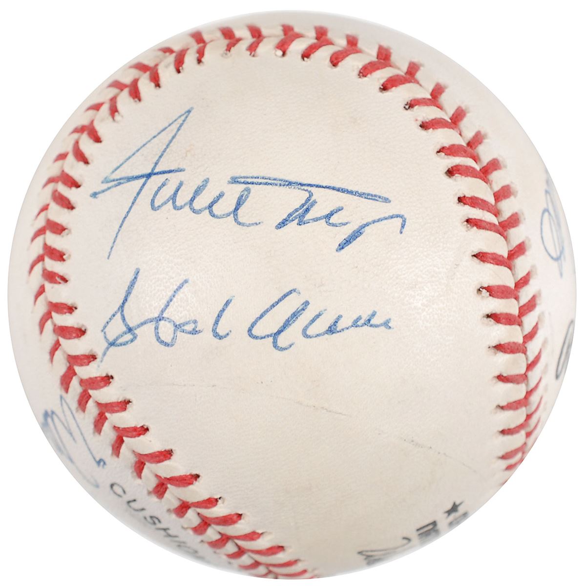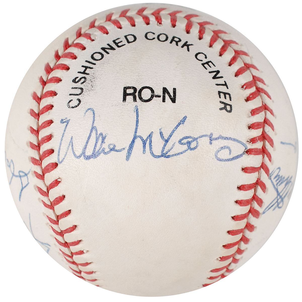 Official Rawlings National League (White) baseball signed in blue ballpoint by six members of the 500 Home Run Club. Signers are: Eddie Mathews, Reggie Jackson, Hank Aaron, Willie Mays, Willie McCovey, and Mike Schmidt. Light scuffing and soiling, otherwise fine condition.