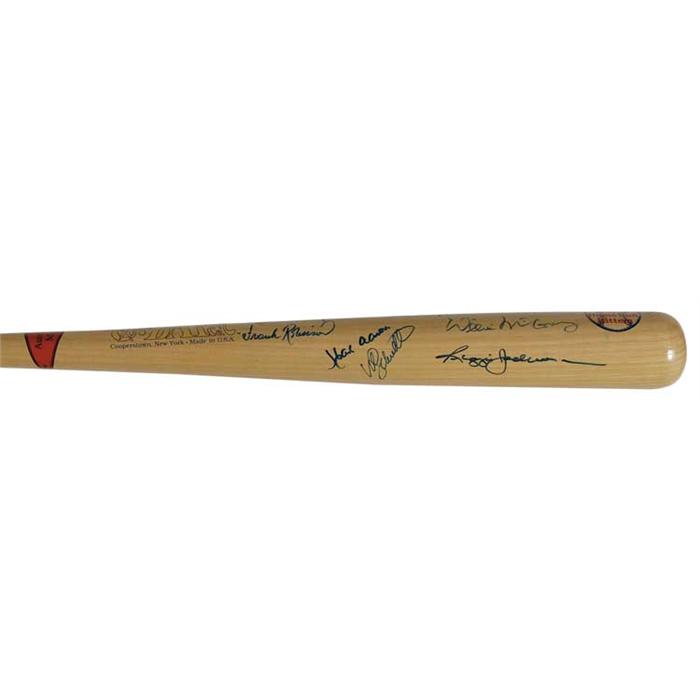 Official Cooperstown Bat Co. 500 Home Run Hitters commemorative baseball bat signed in blue felt tip on the barrel by nine members of the illustrious club: Ernie Banks, Willie Mays, Eddie Mathews, Harmon Killebrew, Mike Schmidt, Reggie Jackson, Hank Aaron, Frank Robinson, and Willie McCovey. Accompanied by a full letter of authenticity from PSA/DNA. In very fine condition. RRAuction COA