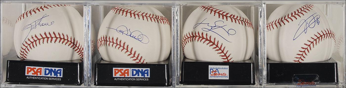 Four official Rawlings Major League baseballs, each signed on the sweet spot in ballpoint by a member of the 500 Home Run Club. Signers are: Manny Ramirez, Jim Thome, Frank Thomas, and Gary Sheffield. Each ball is encapsulated in a plastic PSA/DNA authentication holder, grading all of the balls “MINT 9.” In very fine condition. Each is also accompanied by a full letter of authenticity and grading from PSA/DNA.