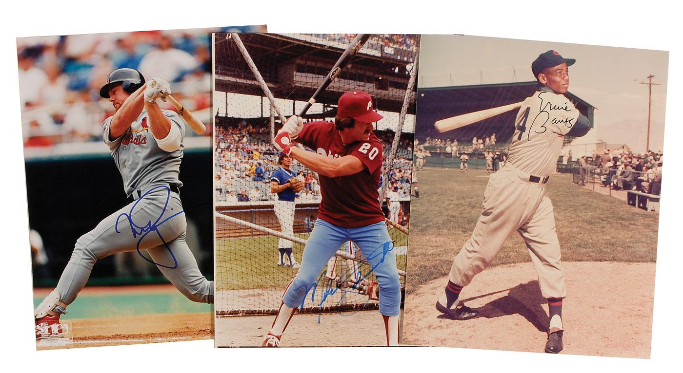 Three 8 x 10 photos, various finishes, each signed in felt tip by the respective 500 Home Run Club member pictured. Signers are: Ernie Banks, Mike Schmidt, and Mark McGwire. In fine overall condition.