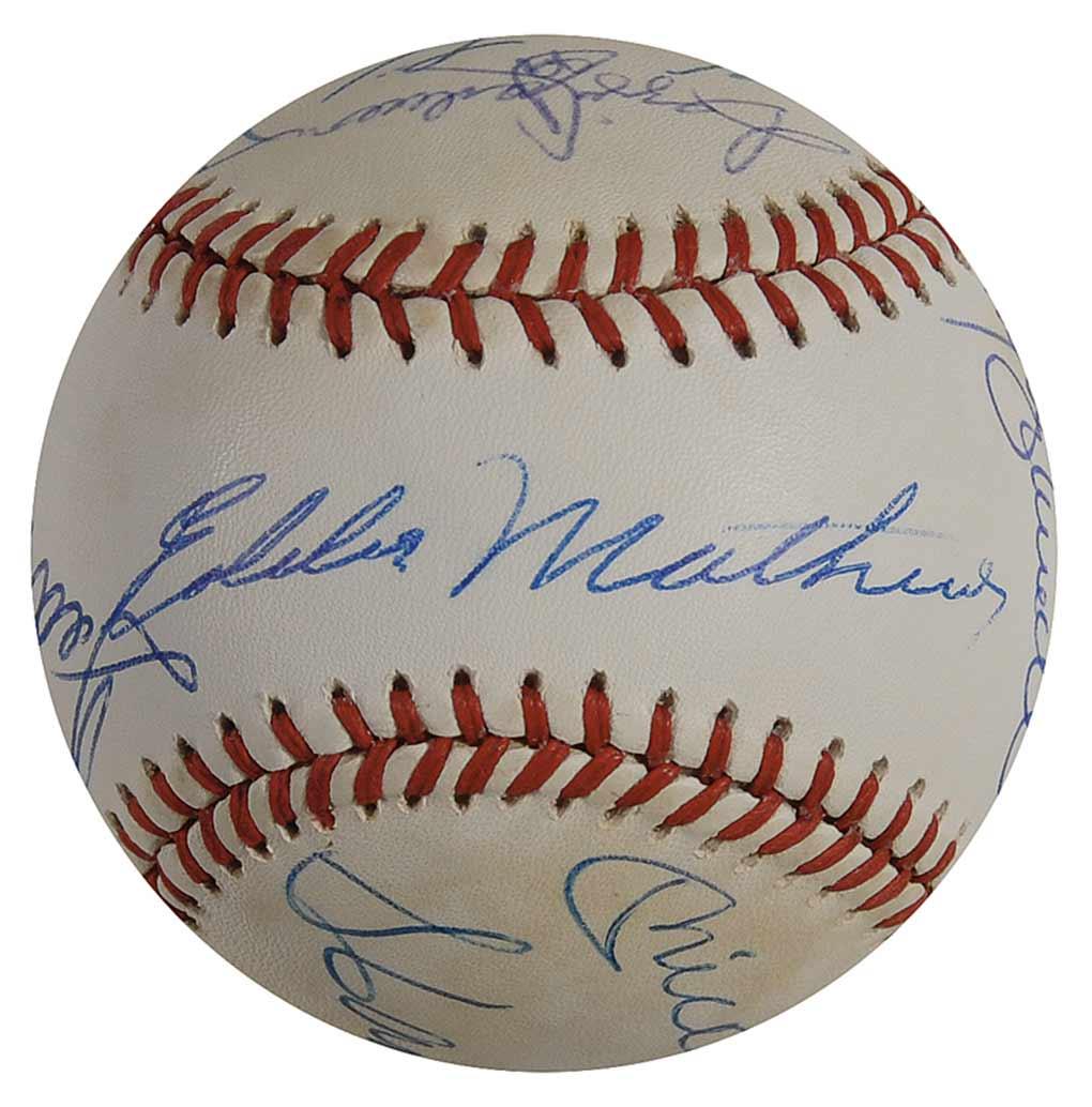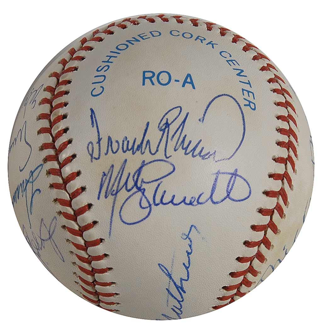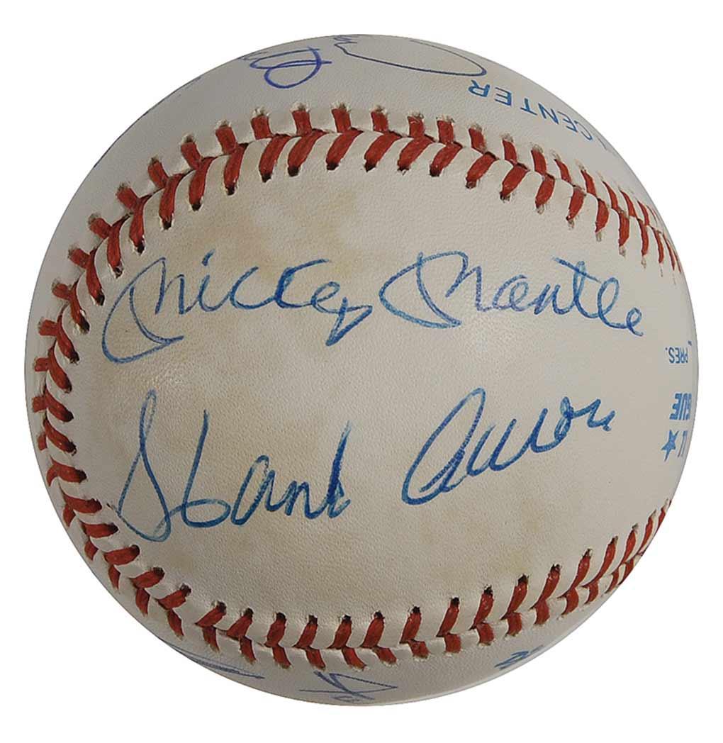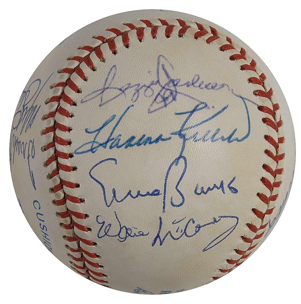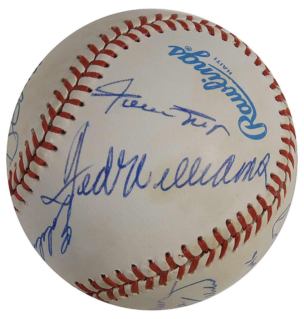Official Rawlings American League baseball signed in blue ballpoint by 11 members of the 500 Home Run Club. Signers are: Ted Williams, Eddie Mathews (ss), Hank Aaron, Ernie Banks, Reggie Jackson, Harmon Killebrew, Mickey Mantle, Willie Mays, Willie McCovey, Frank Robinson, and Mike Schmidt. Accompanied by a full letter of authenticity from PSA/DNA. In fine condition, with scattered light toning to side panels.