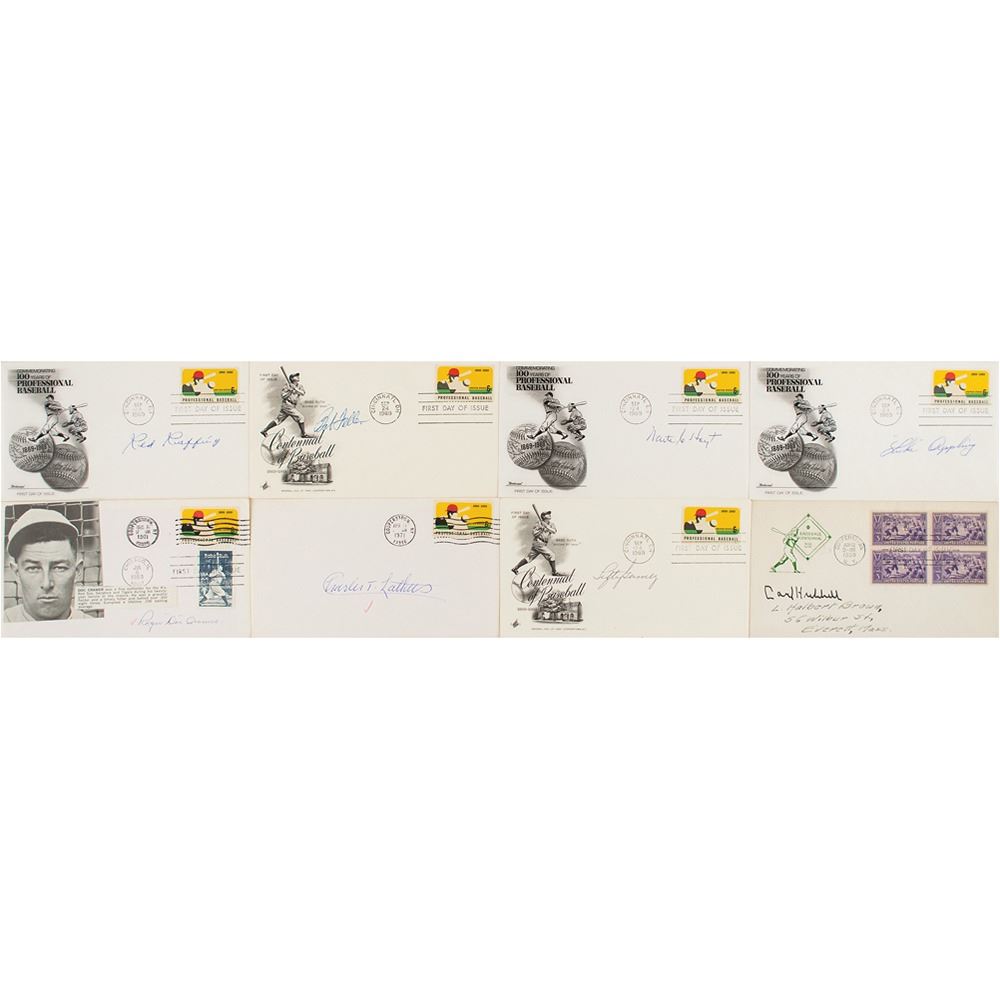 Eight covers, many postmarked at or honoring Cooperstown, individually signed in ink by notable ballplayers. Includes: Lefty Gomez, Carl Hubbell, Red Ruffing, Bob Feller, Waite Hoyt, Luke Appling, Roger 'Doc' Cramer, and Charles T. 'Chick' Lathers. In overall fine condition.