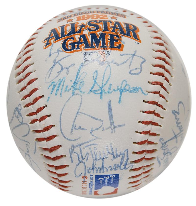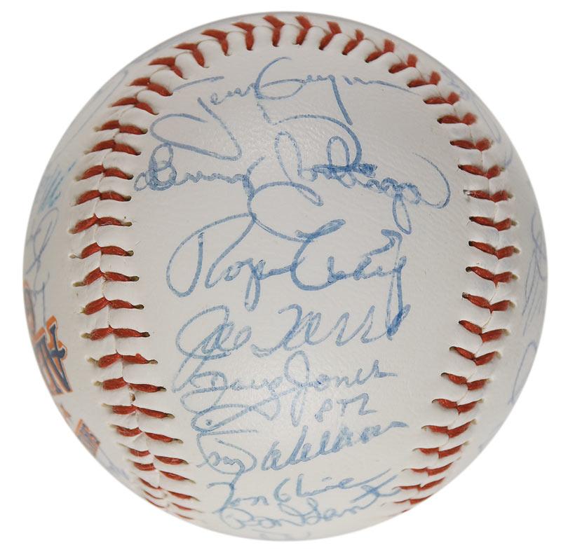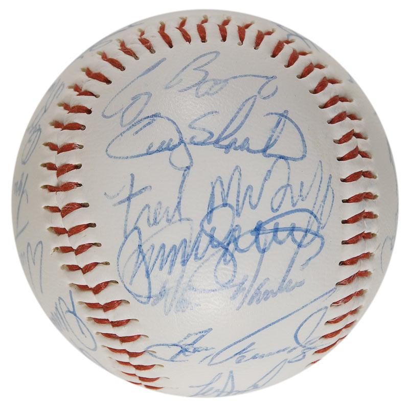 1992 All Star Game commemorative baseball signed in blue ballpoint by 30 members of the 1992 National League All Stars including: Bobby Cox (ss), Tony Gwynn, Ozzie Smith, Ryan Sandburg, Greg Maddux, Gary Sheffield, Lee Smith, Joe Torre, Tom Glavine, Craig Biggio, Will Clark, Benito Santiago, Darren Daulton, Ron Gant, Fred McGriff, and John Smoltz. In fine condition.