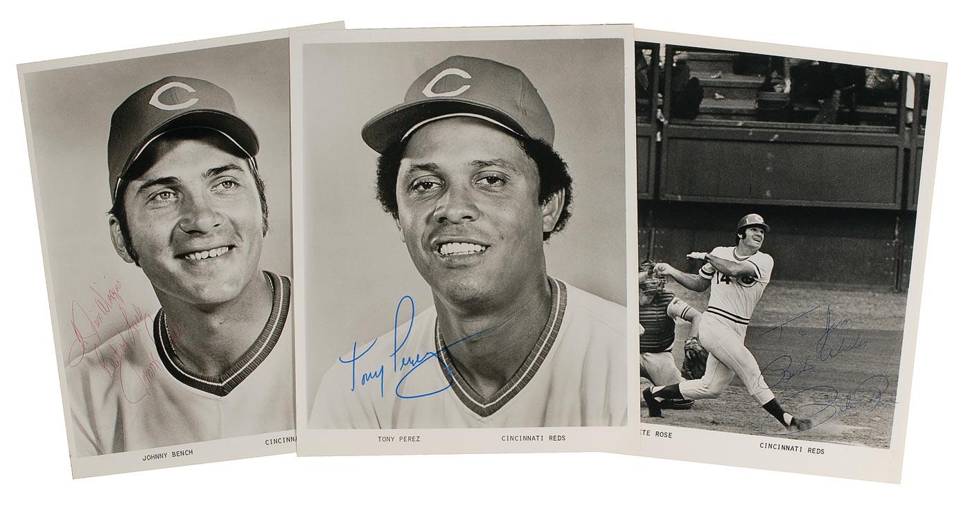 Three glossy 8 x 10 photos, each signed in ballpoint or felt tip by the respective Cincinnati Reds player pictured: Pete Rose (ins), Johnny Bench (ins), and Tony Perez. In fine overall condition, with a small tear to top of Bench’s image.