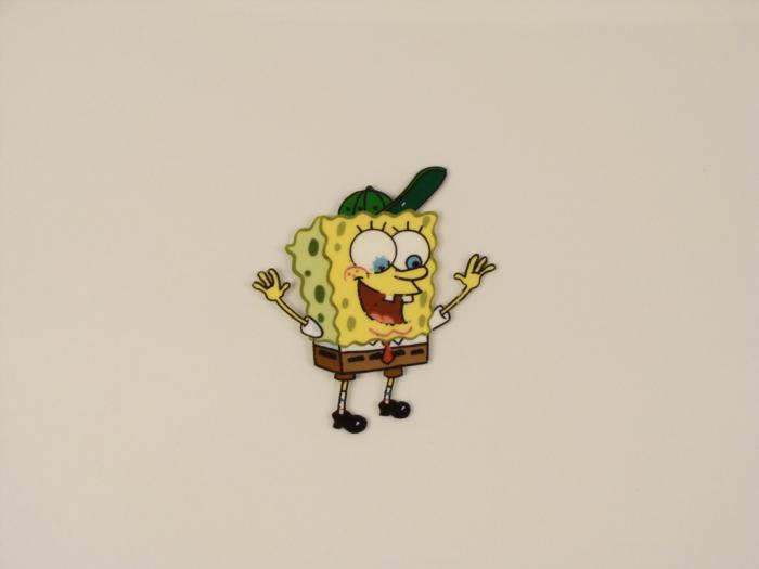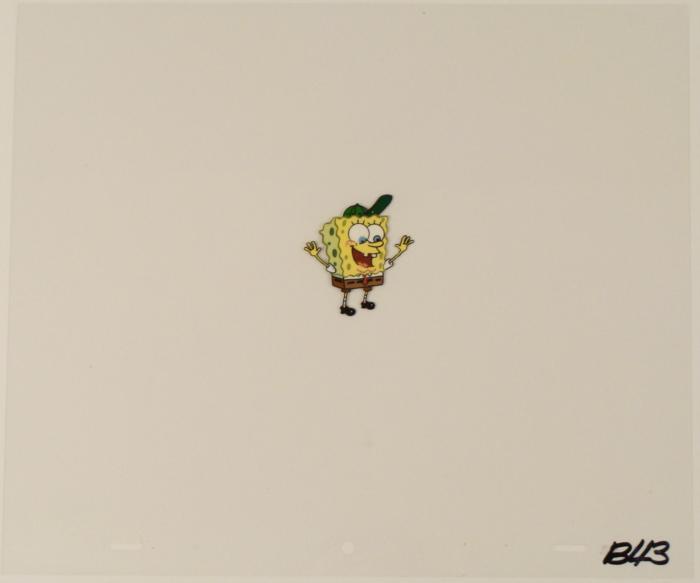 This original animation cel is from the Nickelodeon TV show SpongeBob Squarepants. The story takes place under the deep blue sea in Bikini Bottom, where SpongeBob resides. SpongeBob, who is a yellow, porous sponge, is your typical happy-go-lucky character, as he is always cheerful and enjoys making people laugh. Patrick Star, SpongeBob's neighbor who is a starfish, is your average children's show idiot, as he boasts knowing nothing and is often getting himself into ridiculous situations. Between the homes of these two lies the home of the miserable Squidward, a squid, who is known for being grouchy and playing tricks on SpongeBob and Patrick. Both SpongeBob and Squidward work at the Krusty Krab, a fast food business run by the greedy money-loving Mr. Krabs, a crab, the arch rival of the evil, possibly misunderstood, Plankton. Another neighbor, Sandy Cheeks, an athletic squirrel who normally wears an astronaut's space suit, was introduced in "Tea at the Treedome." She spends most of her time inventing and experimenting. SpongeBob looks very happy with his green baseball cap.Original Production Animated Cel Overall Size of Cel: 10 1/2" x 12 1/2" Very Good ConditionThis is an original hand-painted cel set-up used in the production of an episode of "SpongeBob SquarePants." Each one-of-a-kind set-up represents a slight change in position of the characters. When individually photographed and projected in rapid succession, the images appear to move.
