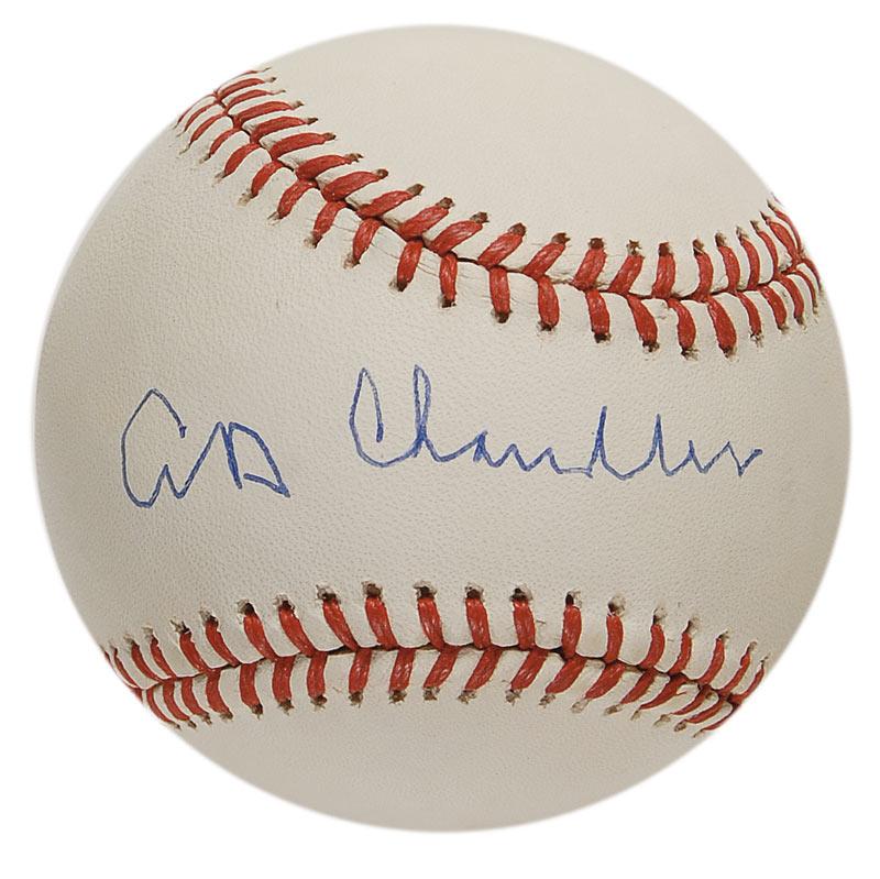 Two items: official Rawlings National League baseball signed in blue ballpoint on the sweet spot, “A. B. Chandler”; and an official Rawlings American League baseball signed in blue ballpoint on the sweet spot, “Fay Vincent.” In overall fine condition, with light toning and evidence of signature removal to the south panel of the Chandler ball.