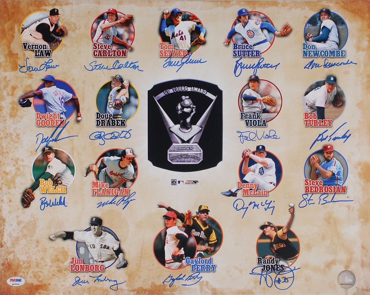 Color satin-finish 20 x 16 photo honoring the Cy Young Award, signed in blue felt tip by sixteen winners, including: Tom Seaver, Steve Carlton, Gaylord Perry, Bruce Sutter, Don Newcombe, Dwight Gooden, Denny McClain, Vernon Law, Doug Drabek, Bob Welch, Mike Flanagan, Jim Lonborg, Randy Jones, Frank Viola, Bob Turley, and Steve Bedrosian. In fine condition, with slight brushing to one letter of Lonborg’s signature and a PSA/DNA label affixed to the lower corner. Accompanied by a full letter of authenticity from PSA/DNA.
