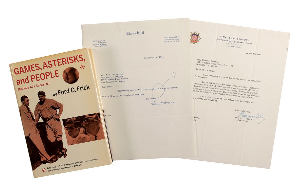 Three items: one-page TLS from 1964, signed “Ford Frick”; a one-page 1966 TLS signed “Warren Giles”; and a hardcover edition of Games, Asterisks, and People, signed and inscribed on the title page by Ford Frick. In fine overall condition, with expected folds to letters, and some light wear and toning to clipped dustjacket.