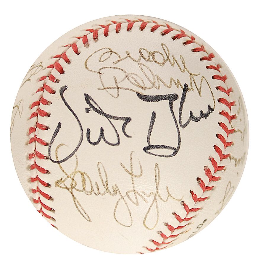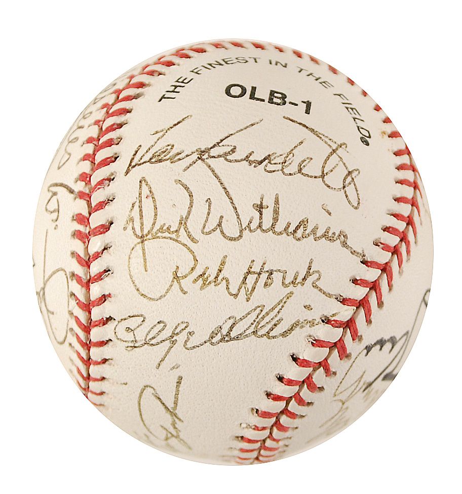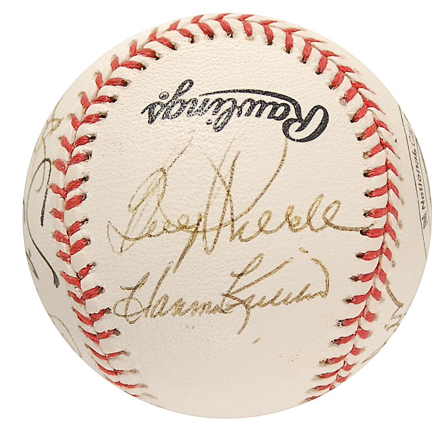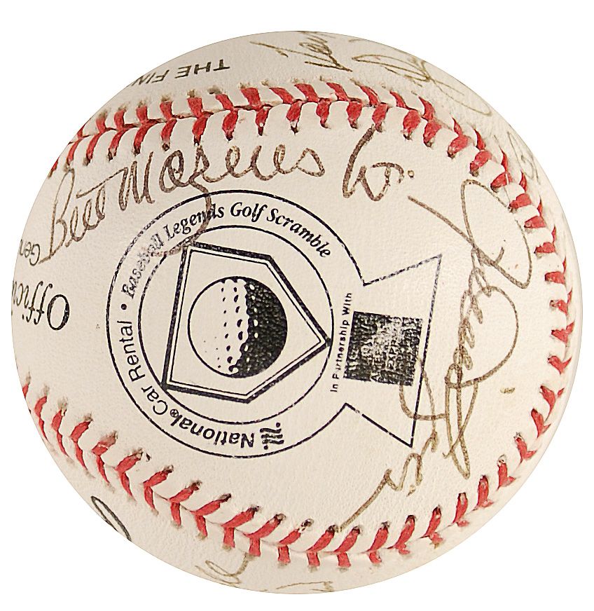 Rawlings Official League baseball with National Car Rental Baseball Legends Golf Scramble logo, signed in black ballpoint and felt tip by twelve baseball greats. Signers are: Harmon Killebrew, Brooks Robinson, Fergie Jenkins (ss), Bill Mazeroski, Rollie Fingers, Billy Williams, Dick Williams, Lew Burdette, Ralph Houk, Vida Blue, Sparky Lyle, and Boog Powell. In fine condition.