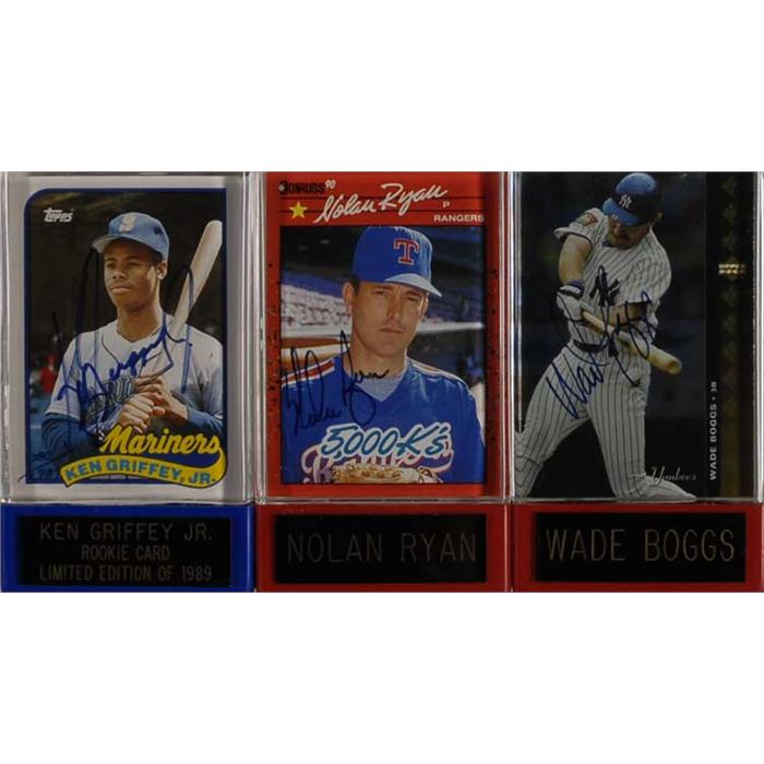 Three color baseball trading cards, various years and makers, each signed on the front in blue felt tip by the respective player pictured: Nolan Ryan, Ken Griffey, Jr., and Wade Boggs. Each card is housed in a removable Lucite display holder. In fine condition. Pre-certified Steve Grad/PSA/DNA and RRAuction COA.