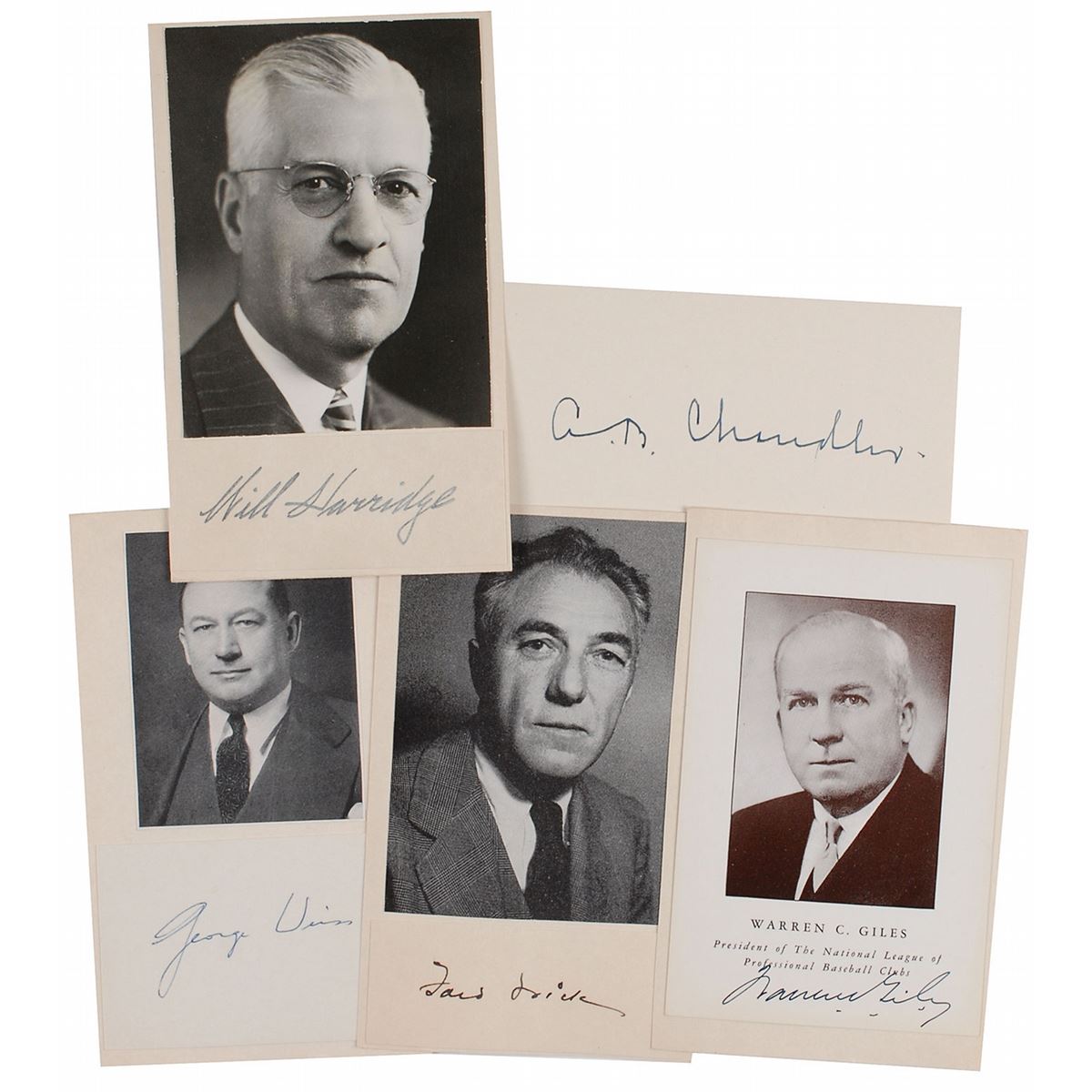 Five items, each signed by a baseball executive enshrined in Cooperstown, primarily signatures on slips affixed to larger 3.5 x 6 cards bearing affixed portraits, including: William Harridge, Ford Frick, Warren C. Giles (SP), George Weiss, and A. B. ‘Happy’ Chandler. In overall fine condition.