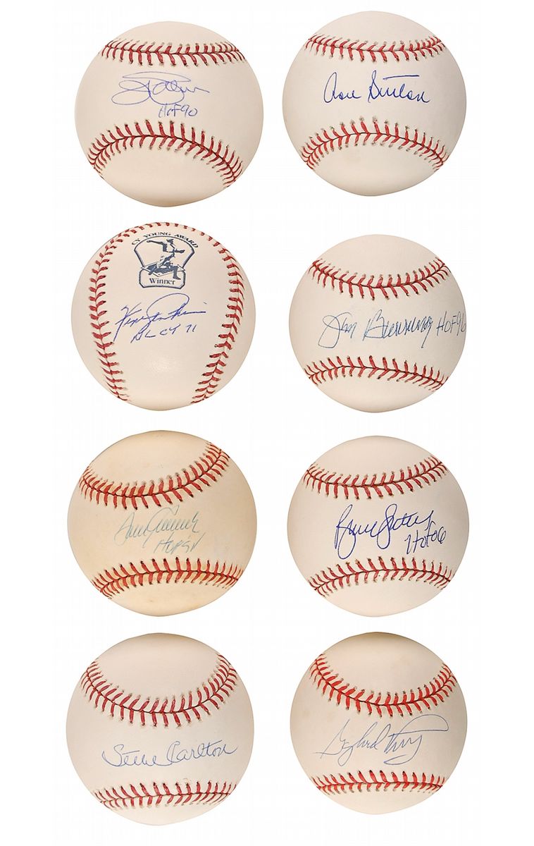 Eight official Rawlings Major League baseballs, each signed in blue ballpoint on the sweet spot or side panel by a different Hall of Fame pitcher. Signers are: Tom Seaver, Steve Carlton, Jim Palmer, Bruce Sutter, Don Sutton, Jim Bunning, Fergie Jenkins, and Gaylord Perry. Many have added the year of their induction. In overall fine condition, with some scattered toning, especially to the Seaver baseball.