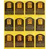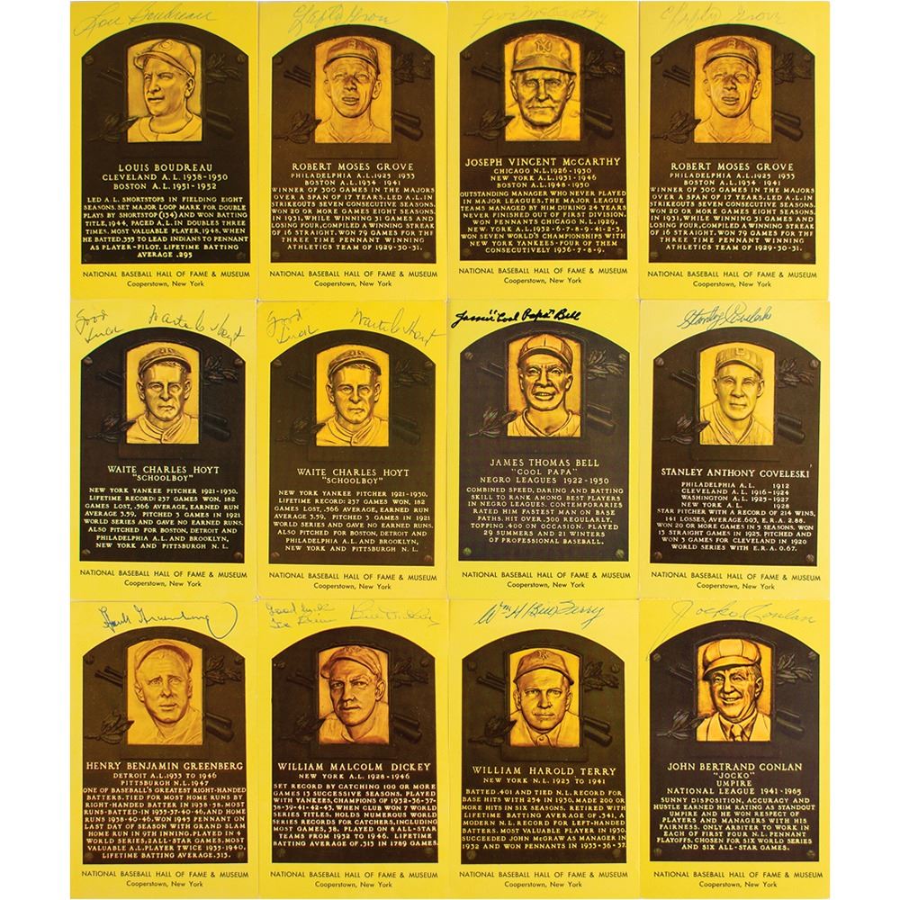 Group of 12 gold Hall of Fame plaque cards, each signed in ink by the subject. Signers are: Hank Greenberg, Joe McCarthy, Lefty Grove (2), Stanley Coveleski, Waite Hoyt (2), James 'Cool Papa' Bell, Jocko Conlan, Bill Terry, Bill Dickey (ins), and Lou Boudreau. In overall fine condition.