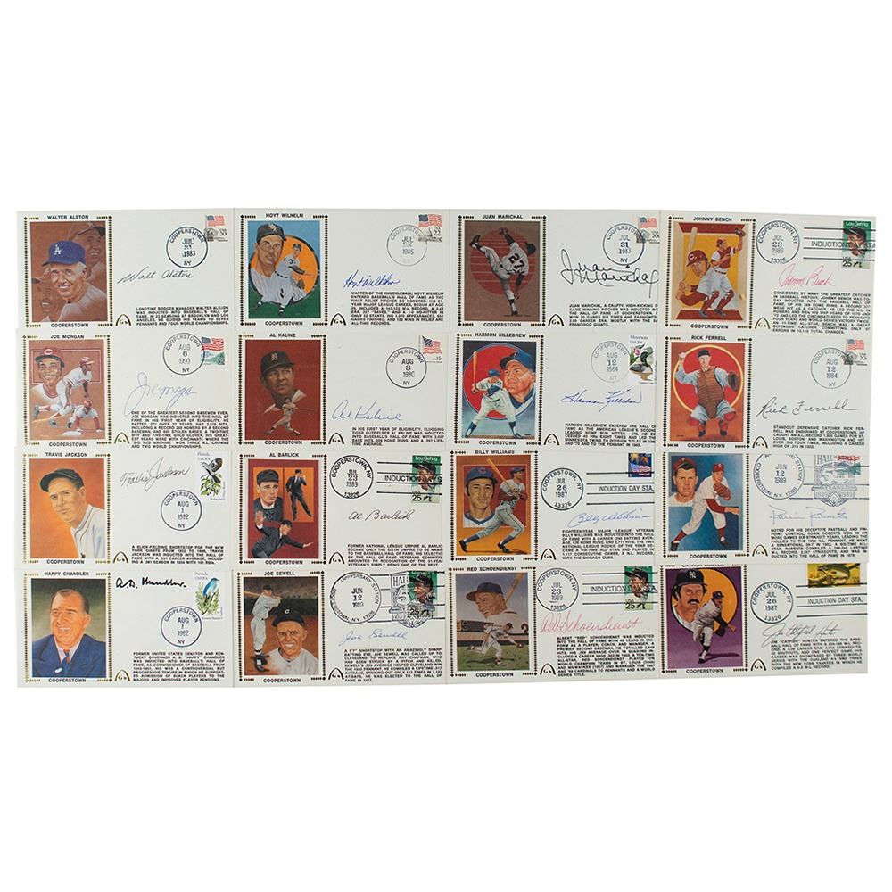 Sixteen Gateway covers with silk color cachets honoring individuals enshrined in Cooperstown, each signed in ink by the subject. Signers are: Harmon Killebrew, Al Kaline, Juan Marichal, Walt Alston, Johnny Bench, Joe Morgan, Hoyt Wilhelm, Rick Ferrell, Billy Williams, Robin Roberts, Jim 'Catfish' Hunter, Red Schoendienst, Joe Sewell, Travis Jackson, Al Barlick, and A. B. 'Happy' Chandler. In overall fine condition.