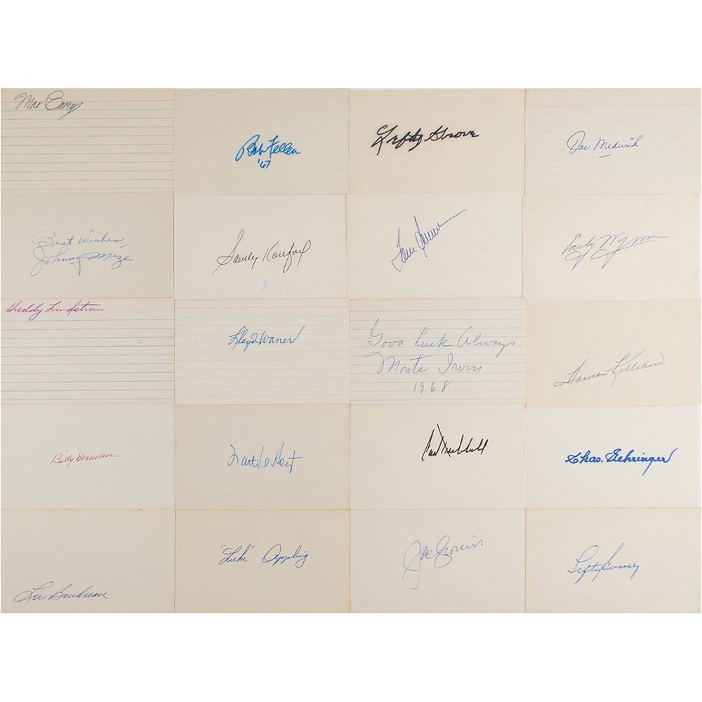Group of 20 ink signatures of Hall of Famers on individual off-white 5 x 3 cards, including: Sandy Koufax, Tom Seaver, Early Wynn, Johnny Mize, Harmon Killebrew, Monte Irvin, Lloyd Waner, Freddy Lindstrom, Carl Hubbell, Charles Gehringer, Waite Hoyt, Billy Herman, Joe Medwick, Lefty Grove, Bob Feller, Lefty Gomez, Joe Cronin, Max Carey, Lou Boudreau, and Luke Appling. In overall fine condition.