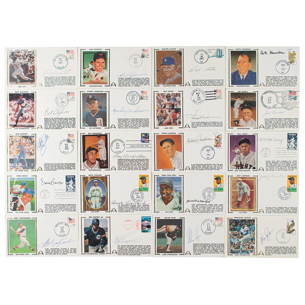 Twenty Gateway covers with silk color cachets honoring Hall of Famers, each signed in ink by a Cooperstown inductee. Signers are: Carl Yastrzemski, Ken Griffey, Jr., Nolan Ryan, Kirby Puckett, Ernie Banks, Mike Schmidt, Rod Carew, Fergie Jenkins, Bert Blyleven, Buck Leonard, James 'Cool Papa' Bell, Judy Johnson, Ray Dandridge, Travis Jackson, Bill Terry, Sparky Anderson, Joe Sewell, Luis Aparicio, Walt Alston, and A. B. 'Happy' Chandler. In overall fine condition.