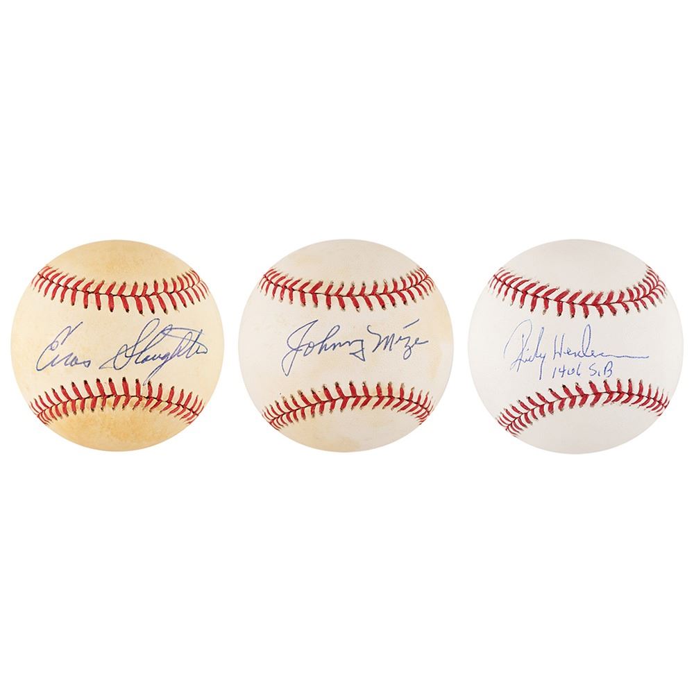 Three official Rawlings baseballs signed by Hall of Famers: an official Major League Baseball (Selig) signed in blue ballpoint on the sweet spot, "Rickey Henderson, 1406 S.B."; an official American League (Brown) baseball signed in blue ballpoint on the sweet spot, "Johnny Mize"; and an official National League (Feeney) baseball signed in blue ballpoint on the sweet spot, "Enos Slaughter." Henderson is in very fine condition, with an affixed Steiner hologram; the others are in very good to fine condition, with scattered toning.