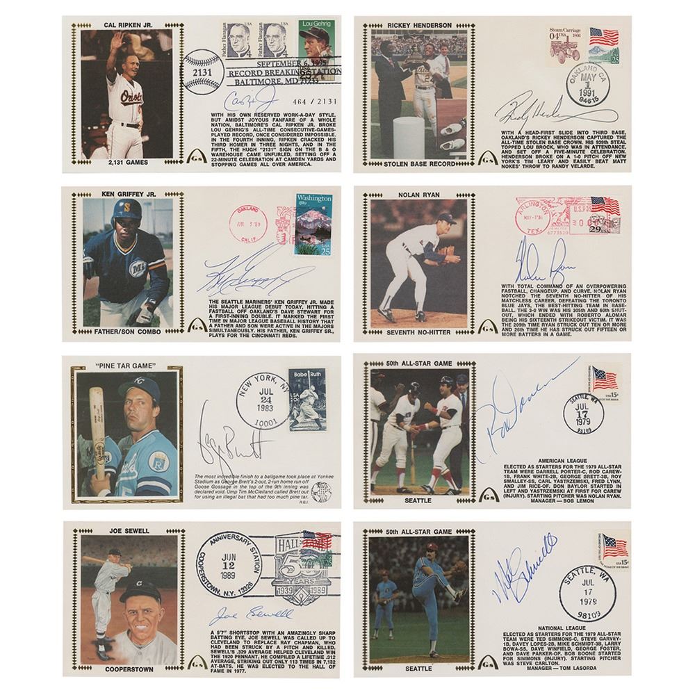 Eight Gateway covers with silk color cachets honoring Hall of Famers, each signed in ink by the subject. Includes: Ken Griffey, Jr., George Brett, Rod Carew, Mike Schmidt, Cal Ripken, Jr., Rickey Henderson, Nolan Ryan, and Joe Sewell. In overall fine condition.