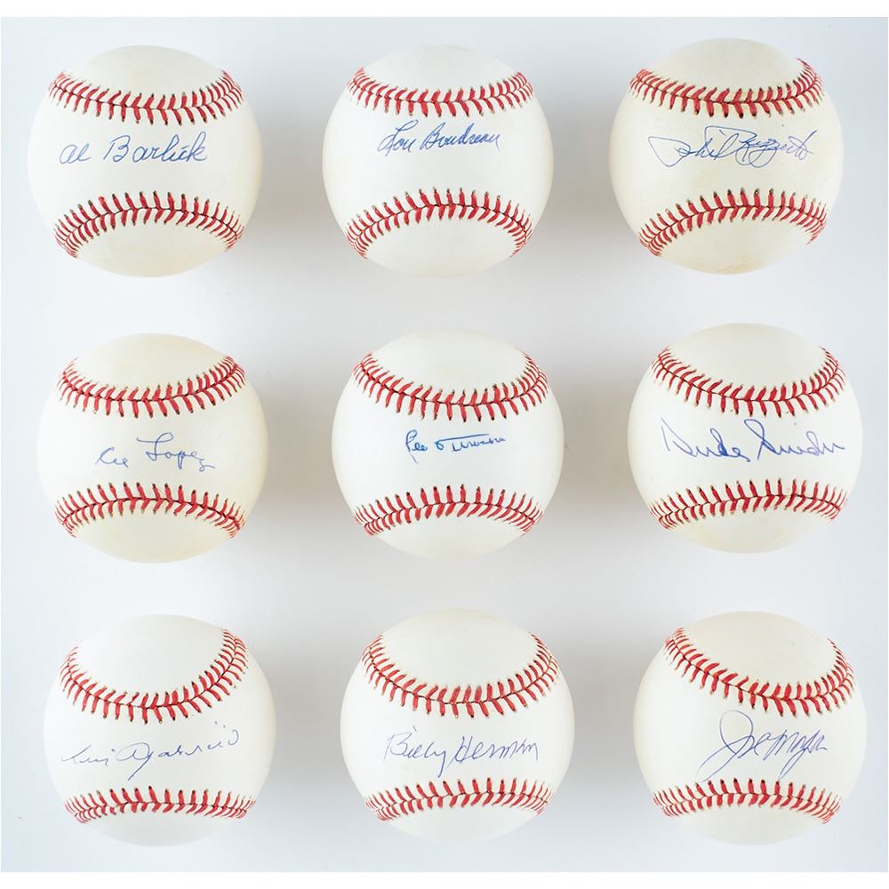 Nine official Rawlings American and National League baseballs, individually signed on the sweet spots in ballpoint by Hall of Famers. Signers are: Luis Aparicio, Al Barlick, Lou Boudreau, Leo Durocher, Billy Herman, Al Lopez, Joe Morgan, Phil Rizzuto, and Duke Snider. In overall fine condition, with some very mild toning.