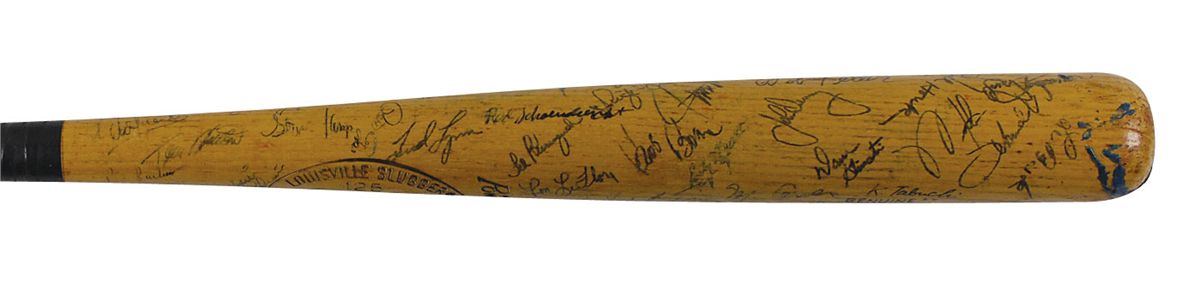 Official Louisville Slugger Philadelphia Phillies baseball bat signed in black felt tip on the barrel by 30 Hall of Famers and baseball greats. Signers include: Ted Williams, Joe DiMaggio, Roger Maris, Steve Carlton, Mike Schmidt, Bob Feller, Stan Musial, Red Schoendienst, Willie Mays, Pee Wee Reese, Lou Brock, Jim Rice, Fred Lynn, Dwight Evans, Early Wynn, Tim McCarver, Ralph Kiner, Rico Petrocelli, Jim Lonborg, Ralph Houk, Jerry Koosman, Bob Boone, Richie Hebner, Ted Kluzewski, Pete Rose, Jerry Martin, and Greg Luzinski. Some signatures a shade or two light, taped handle, and remnants of a hard blue substance to end of barrel, otherwise fine condition. Accompanied by several candid photos of the bat’s owner posing with DiMaggio, Feller, Maris, Mays, and Williams. The Williams photo is particularly interesting, as Ted is posing with this exact bat, instructing a Red Sox rookie on proper hitting technique.
