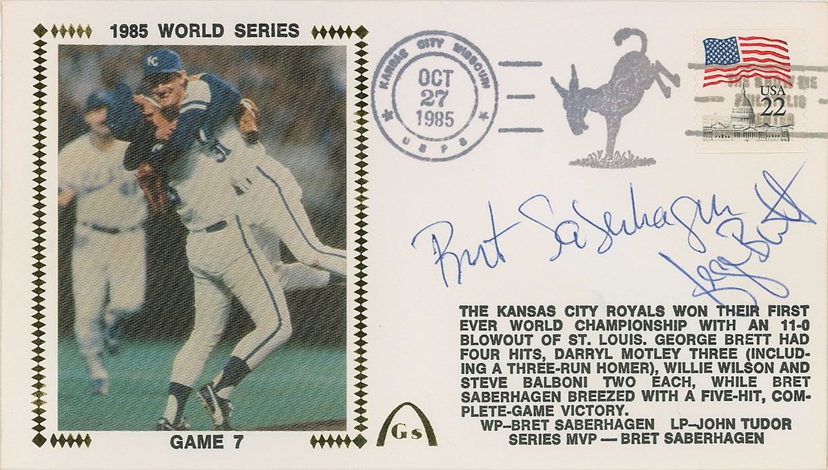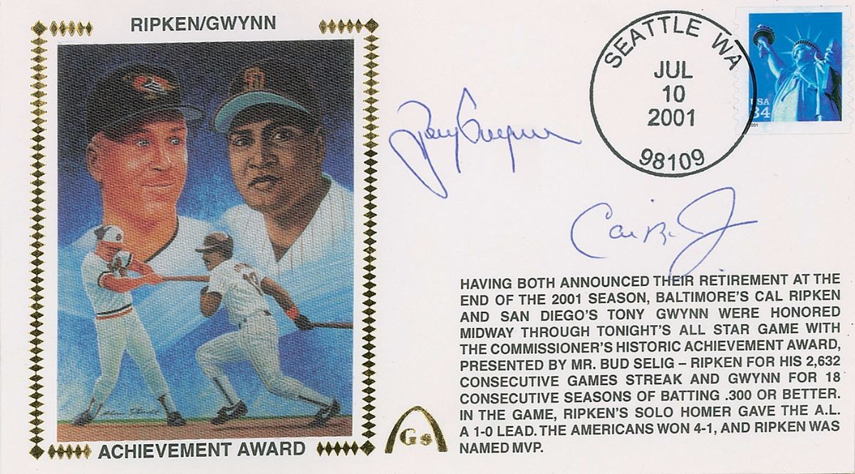 Terrific set of ten Gateway covers with silk cachets honoring various baseball legends, each signed by two players in ink or ballpoint, including: Cal Ripken, Jr., and Tony Gwynn; Dave Winfield and Steve Garvey; Jim Sundberg and Frank White; Brett Saberhagen and George Brett; Wade Boggs and Bill Buckner; Jim Rice and Calvin Schiraldi; Dane Iorg and Charlie Leibrandt; Norm Charlton and Rob Dibble; U. L. Washington and George Brett; and Rick Dempsey and one other. In overall fine condition.