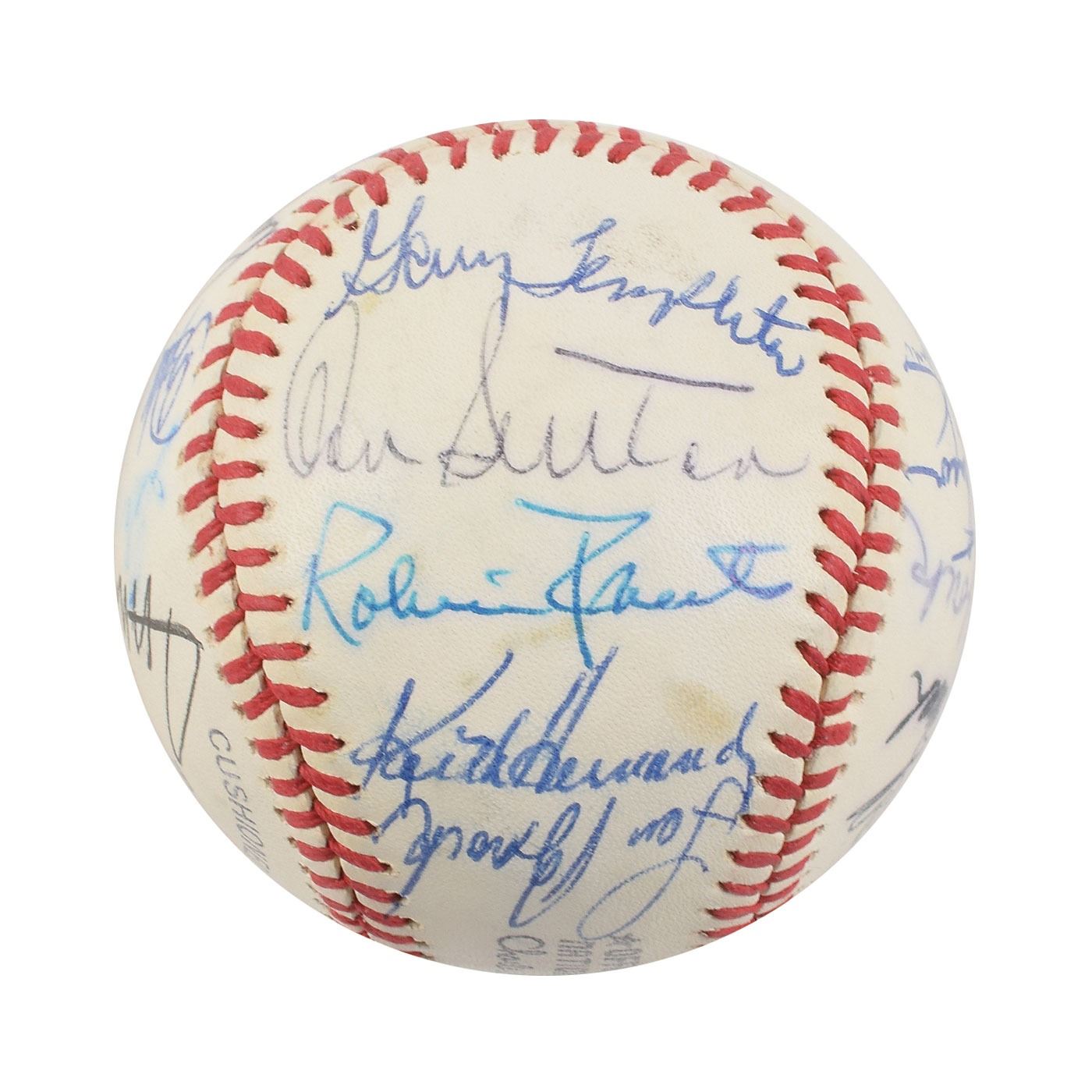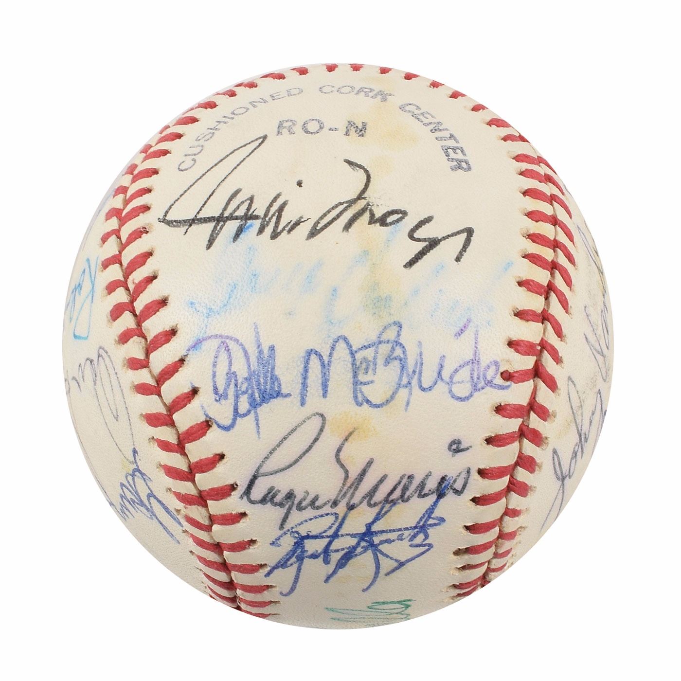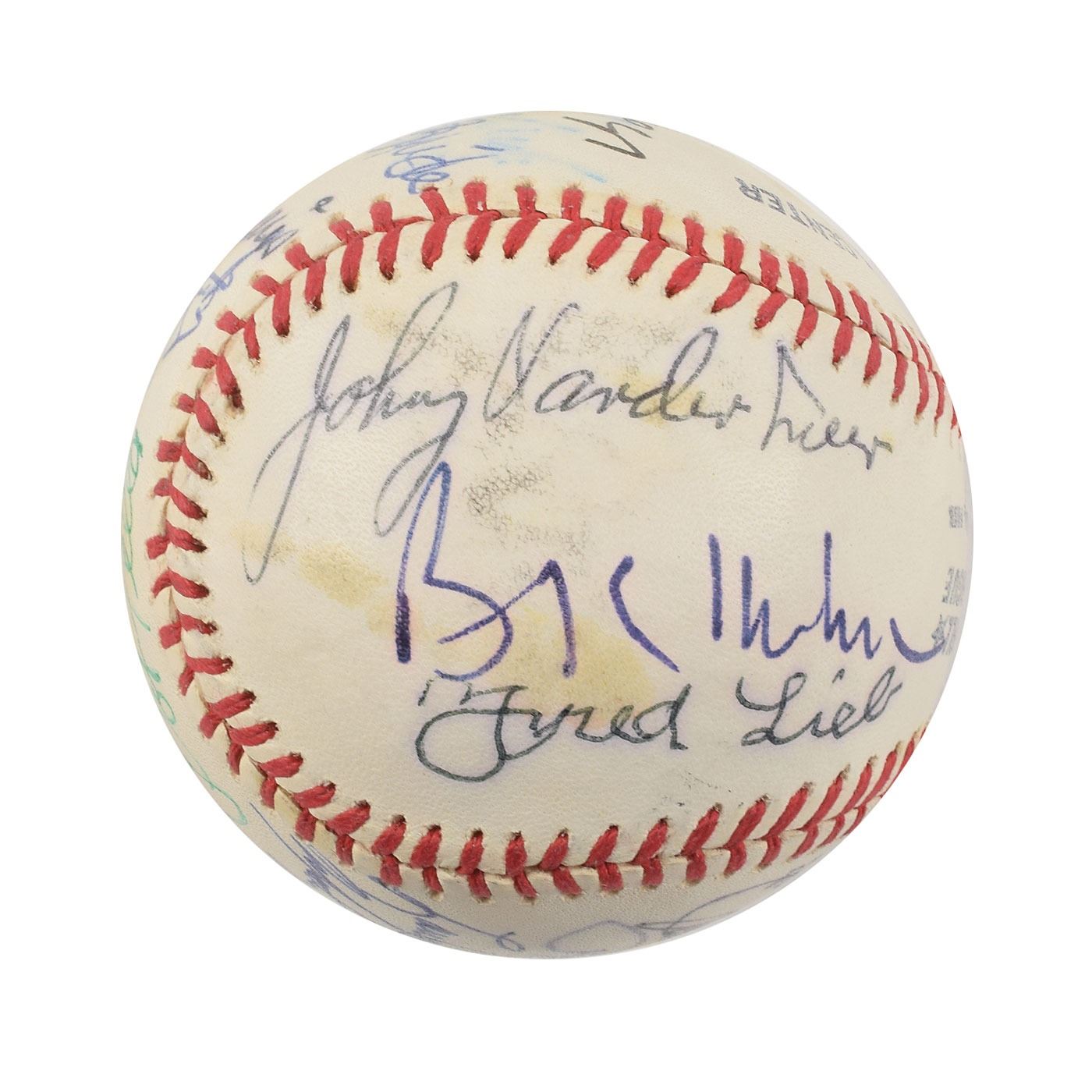 Official Rawlings National League (Feeney) baseball signed in felt tip on the sweet spot and side panels by 18, including: Bob Feller (ss), Willie Mays, Roger Maris, Johnny Bench, Lou Brock, Bowie Kuhn, Don Sutton, Robin Roberts, Keith Hernandez, Johnny Vander Meer, Ralph Houk, sportswriter Fred Lieb, and others. In fine condition, with a few spots of toning and soiling. Accompanied by a full letter of authenticity from JSA.
