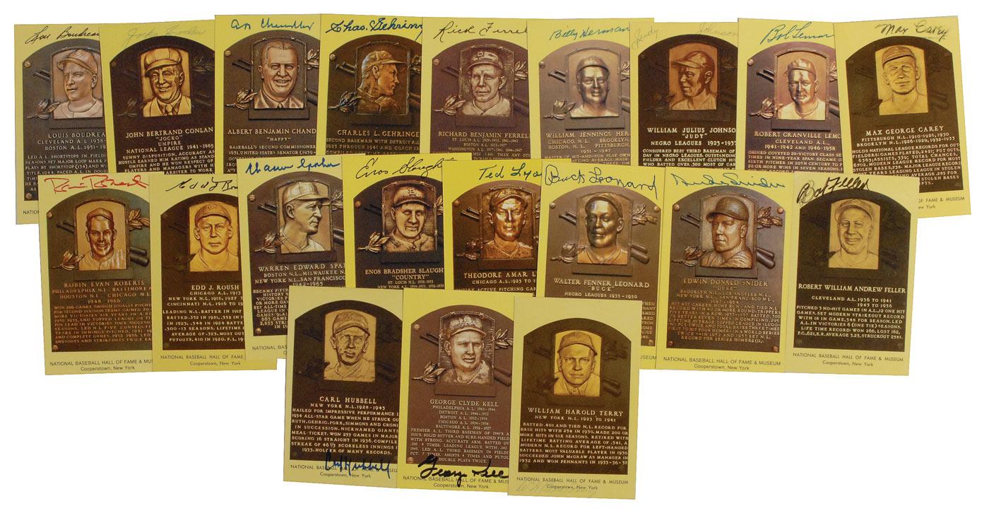 Twenty gold Hall of Fame plaque cards, each signed on the front in felt tip or ink by the respective Hall of Famer pictured. Signers are: Lou Boudreau, Jocko Conlan, Max Carey, Rick Ferrell, A. B. Chandler, Chas. Gehringer, Carl Hubbell, Billy Herman, Judy Johnson, George Kell, Bob Lemon, Ted Lyons, Buck Leonard, Robin Roberts, Edd Roush, Warren Spahn, Enos Slaughter, Wm. H. ‘Bill’ Terry, Duke Snider, and Bob Feller. In fine overall condition, with irregular ink adhesion to several signatures.